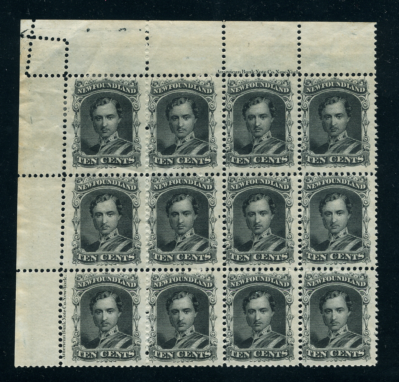Spectacular imprint corner block of twelve. Single hinge mark in upper left encroaching on stamp with balance being never hinged. Few natural bends. Extremely scarce large multiple. Ex. Liectenstein, "Zurich" and Baillie. Unitrade $8520