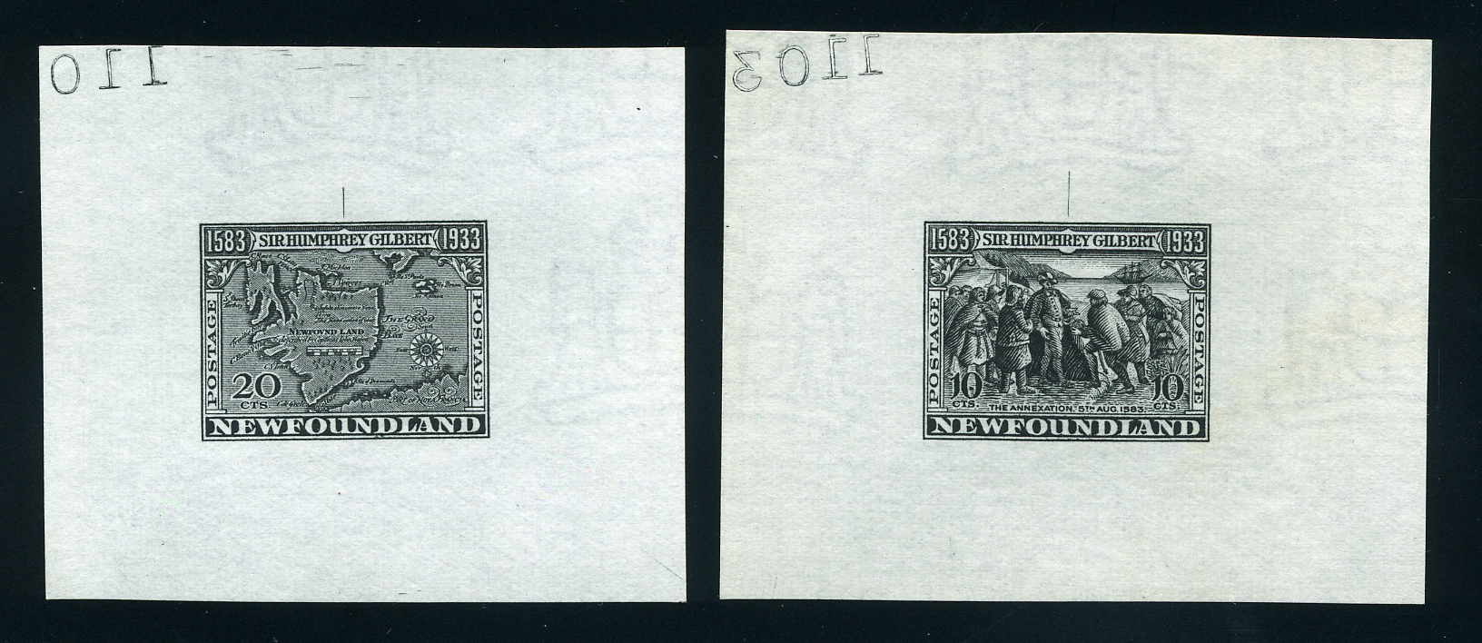 Lot #788 Newfoundland #212-225P – Sir Humphrey Gilbert Issue. Impressive and very interesting complete set of numbered die proofs of this 1933 issue. Printed entirely in black, the clear details are extensive. The thin, translucent paper shows the Coat of Arms watermark of the issue, uncharacteristic of most die proofs. Suitable for exhibition. Est:$6000