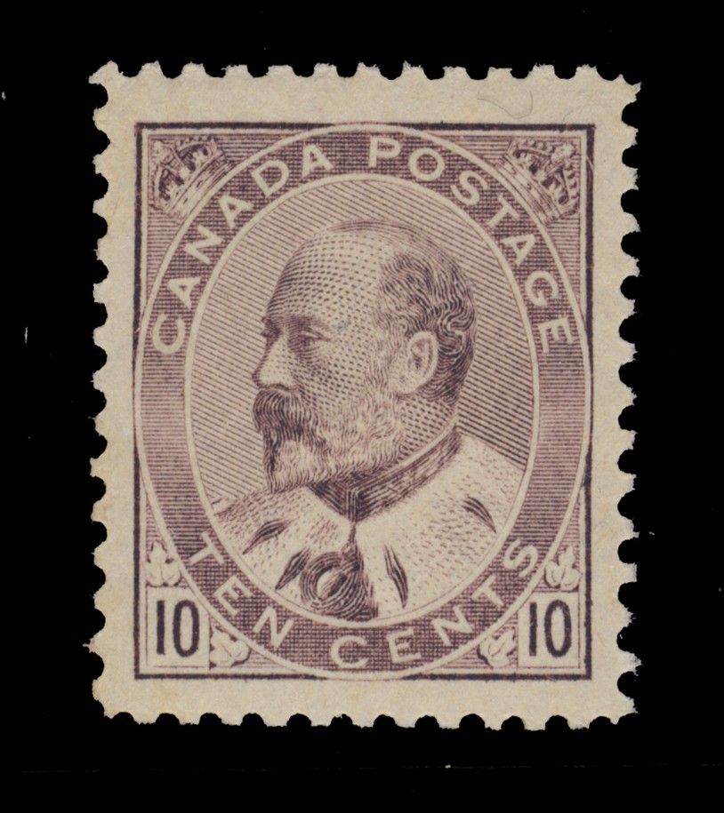 Canada #93, 1903 10¢ brown lilac King Edward, with immaculate gum and large balanced margins, mint never hinged, extremely fine.