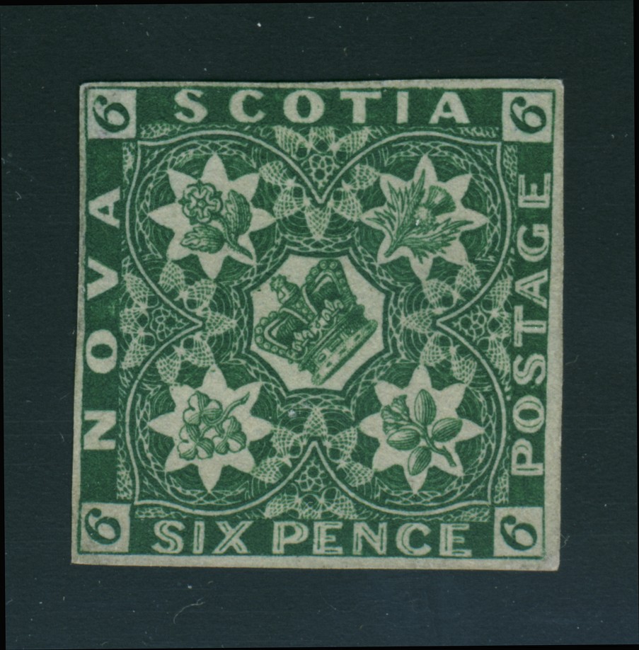 Nova Scotia #5, 1857 6d dark green Heraldic on bluish paper, unused no gum with well clear to full margins on all sides, fine-very fine. Accompanied by 2009 Greene Foundation certificate. One of the rarest British North America stamps in mint or unused condition and a world class rarity. Unitrade CV $8750
