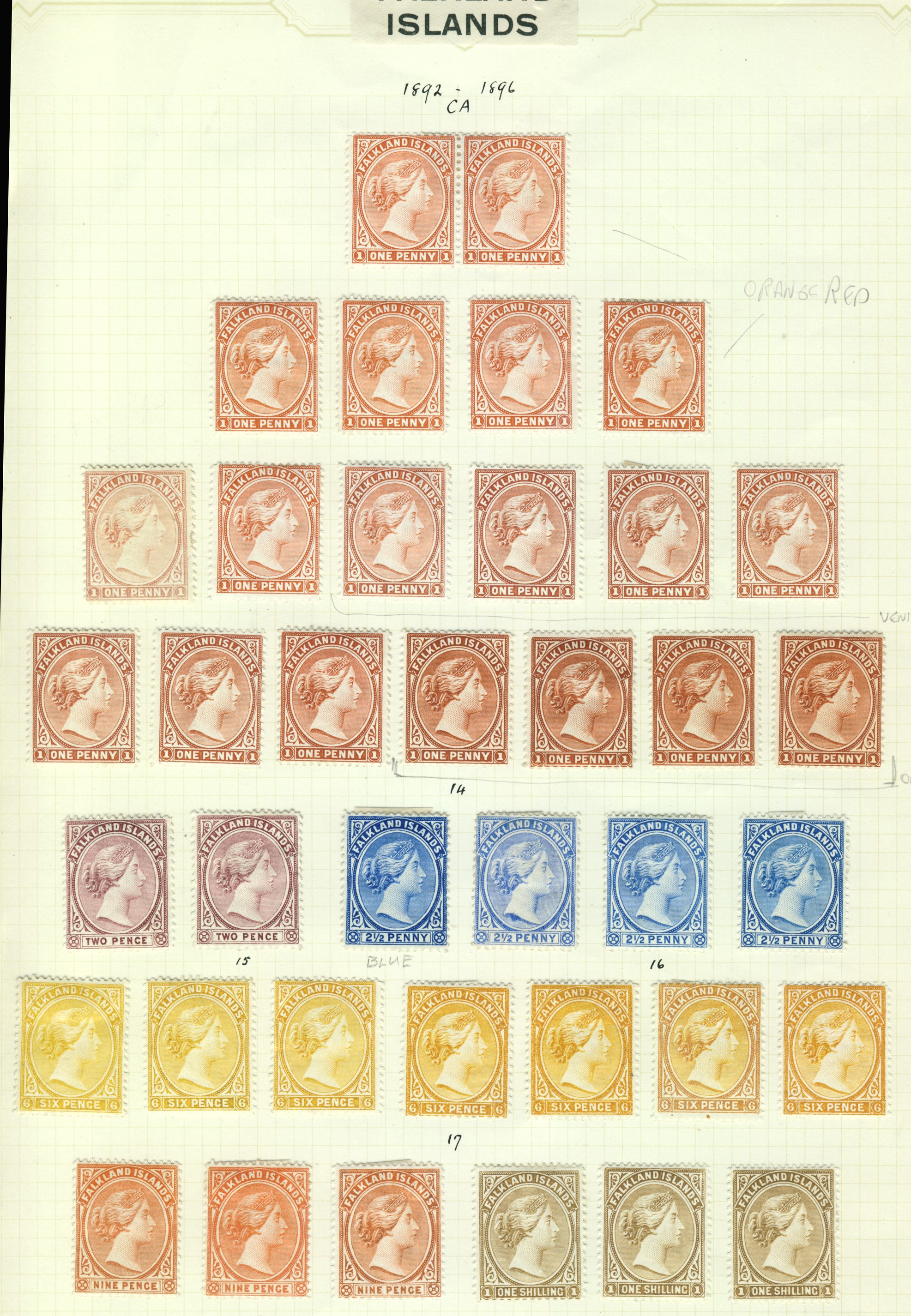 Falkland Islands #11-18, 1891-1896 1d/1sh, a page from a pre-WWII collection showing range of shades. Stamps are still hinged to original page. We quickly examined the backs and found no thins or other faults, though all have hinge remnants and about half a dozen are unused no gum. The key values have o.g. We identified the following by Scott: 1d #11 (4, plus 3 unidentified to the left), 11B (2), 12 (6), 12 (4), 13 (2), 14, 15 (2), 15a, 16 (3), 16a (4), 17 (2), 17a, 18, 18a (2). A great lot for the specialist. Fine-very fine. Scott CV $2230