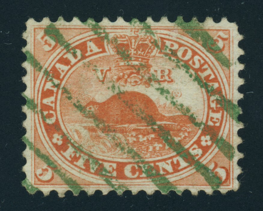 Canada #15 1859 5¢ red Beaver, well centered with bold grid cancel in bright green ink. A striking stamp. Estimate $75 Realized $253 including premium.