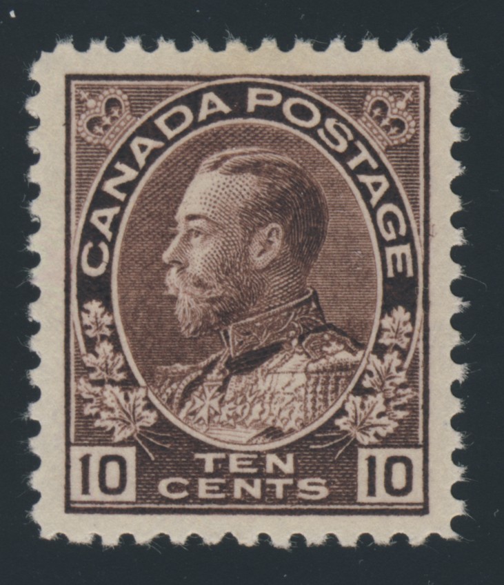 Lot 272, Canada #116, Realized $977 July 24, 2020December 21, 2009 by Sparks Auctions This achieved a strong price—but not a record—selling at $850 after some spirited bidding. Canada #116 1912 10¢ plum Admiral, mint never hinged, very fine. Unitrade CV$1200, realized$977 including premium.