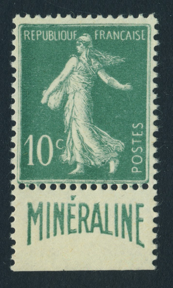 France #163c var 1924-1926 10c green Sower from Minéraline booklet, mint never hinged single, very fine. (Scott CV for complete hinged booklet pane of 10 is $3,200.) Yvert et Tellier CV€700, realized $546 including premium.