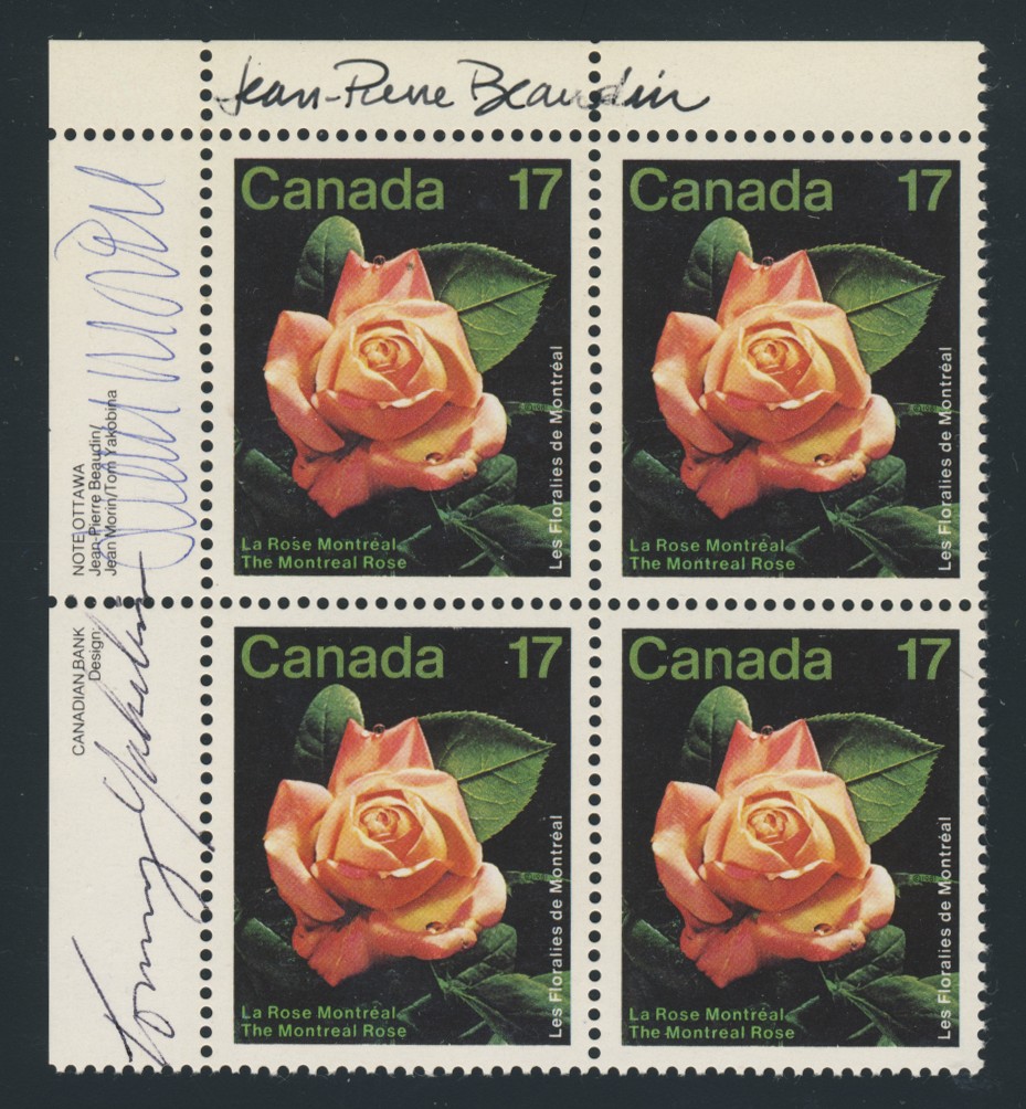 Lot 492 1981 Les Floralies issue, plate block signed by the 3 designers: Jean-Pierre Beaudin, Jean Morin and Tom Yakobina, very fine, never hinged. Plus two negative pictures, one of which was used for the final design and second showing the grounds of the exhibition (both previously unrecorded), plus 2 matched set of plates blocks, a few singles and a First Day cover (these not signed). Estimate: $75