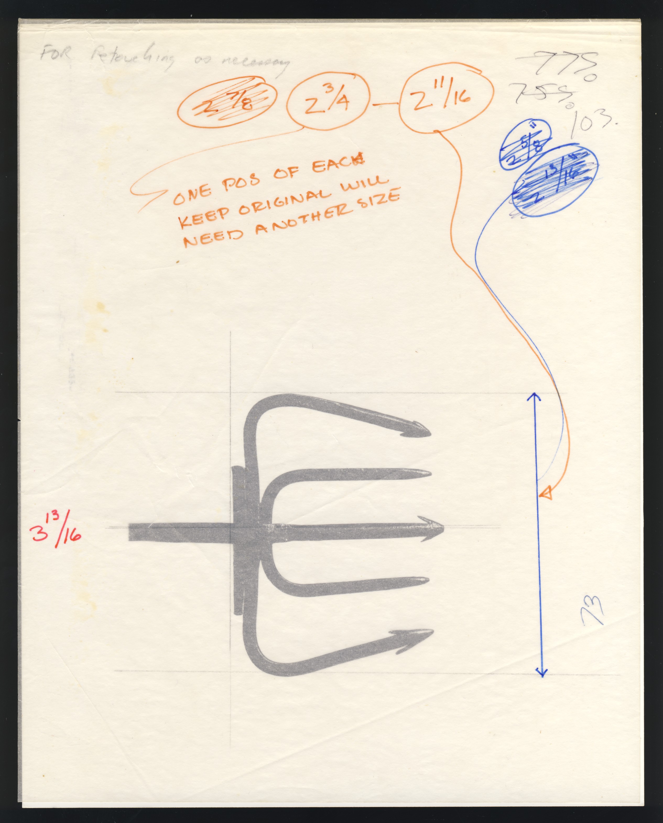 Lot 494 1982-1987 2c Fishing Spear large size black and white photographs, one of the original unaccepted design showing an "open" spear, 160x195mm pasted on larger card, and second photograph of revised design with "closed" spear with glassine overlay showing various notations from the designer ("For retouching as necessary"). Very fine and unique. Estimate: $250