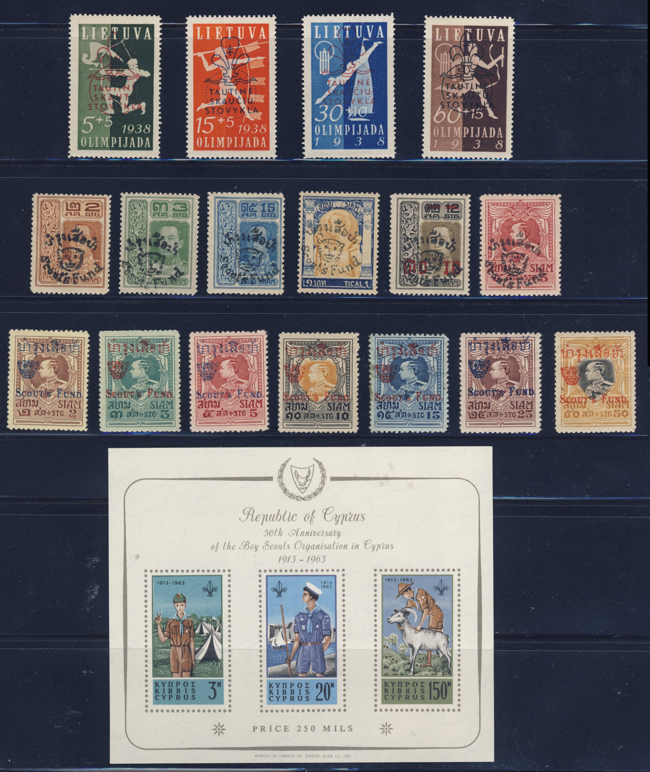 LOT 2052 — Scout collection includes both Boy Scouts and Girl Guide stamps, over 5,000 stamps in 16 binders and including over 660 souvenir sheets (hinged and never hinged), over 580 imperfs, 265 gutter pairs plus other miscellaneous items such as covers. A major portion of the collection is mint. About one third of the carefully assembled collection is British Commonwealth. We noted 1938 Lithuania athletic set overprints (NH), 1920 Siam semi-postals #B18-B30 (hinged, B30 thinned), 1963 Cyprus 50th anniversary souvenir sheet (NH, trivial stains), 1969 Sierra Leone #382-387 and C100-C105 (both NH) and 1973 Tonga #322-326, C130-C134, CO79-CO71 (NH). Est. $2000.