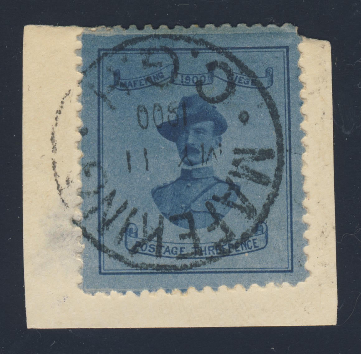 LOT 958CAPE OF GOOD HOPE #180 1900 Used 3p blue on blue Baden-Powell, 21mm wide, perf 12, on piece dated MY.11.00, very fine. Scott CV$1500.