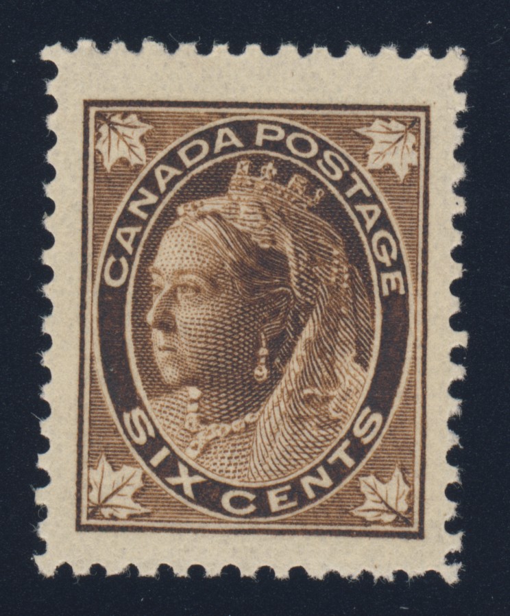 Lot 380 — Canada #71 1897 6¢ brown Leaf, huge margins, fresh, lightly hinged, very fine. Unitrade CV$200.