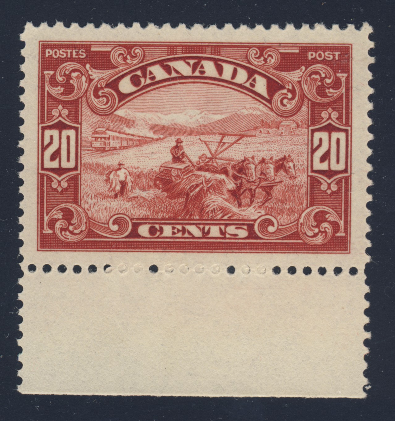 Lot 523 — Canada # 157 1929 20¢ dark carmine Harvesting Wheat marginal example with jumbo margins, immaculate, extremely fine, never hinged. An exceptional stamp in every respect. Unitrade CV$200.