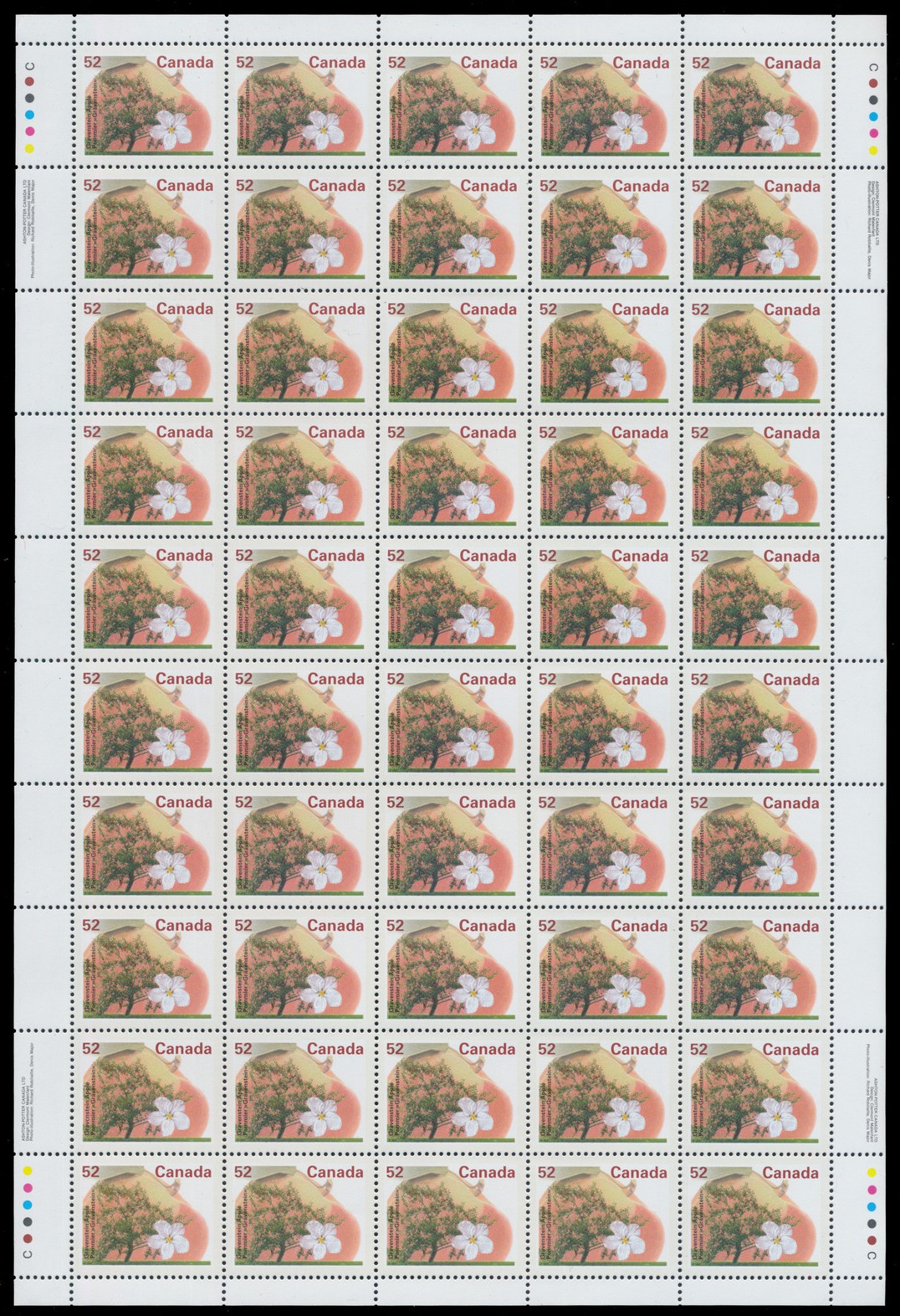 Lot 225 Canada #1366i 1996, 52c Gravenstein Apple, perforated 13.1, sheet of 50 with plate inscriptions, mint never hinged, Unitrade footnote highlights “plate blocks of this issue are very scarce,” fresh and very fine. Unitrade CV$804, sold for C$700.00 plus 17% buyer’s premium.