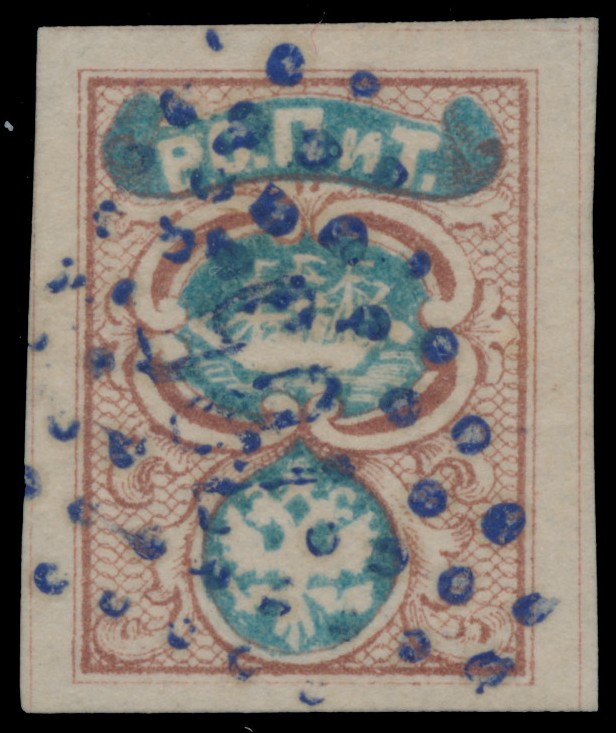 Lot 627, Russia 1850 Russian Company of Navigation and Trade 10pa brown & blue Steamer & Eagle, XF usedLot 627 Russia #2 1850, Russian Company of Navigation and Trade (ROPiT), 10pa brown & blue Steamer & Eagle, imperforate, four enormous balanced margins, neatly-struck ‘785’ numeral lozenge of Alexandria in blue, a choice example, extremely fine; signed Zumstein. (Mi. 1) Scott CV U$750.