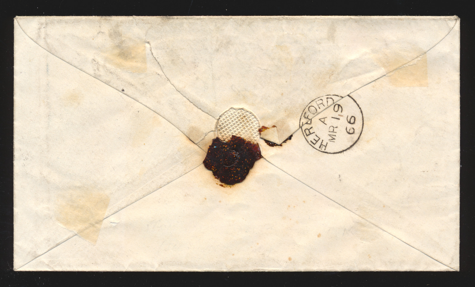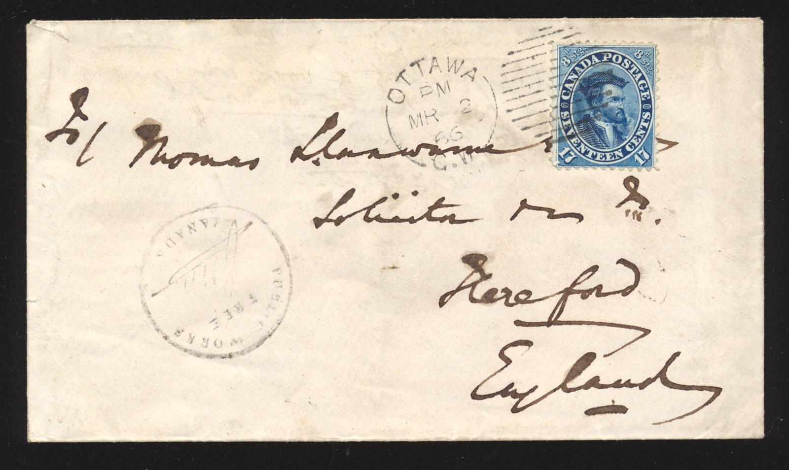 Lot 586, Canada 1886 17c blue Cartier Public Works cover, Ottawa to Hereford EnglandLot 586, Canada 1886 17c blue Cartier Public Works cover, Ottawa to Hereford EnglandLot 586 1866 (March 2), “Public Works / Canada / Free” on 17c blue Cartier cover, to Hereford, England, adhesive tied by Ottawa duplex, carried via New York by the steamer “Cuba” of the Cunard Line, arriving on March 18, with next-day Hereford c.d.s. arrival backstamp, tear through flap, sender’s notation under flap, some light soiling in places, but a rare cover, this circular Public Works handstamp unrecorded by Davis in “An Overview of the Canadian Government Official Handstruck Postal Markings”, where it is noted that “all known Public Works handstamps are hexagonal shaped,” not the case in this instance, fine-very fine. Estimate C$500.