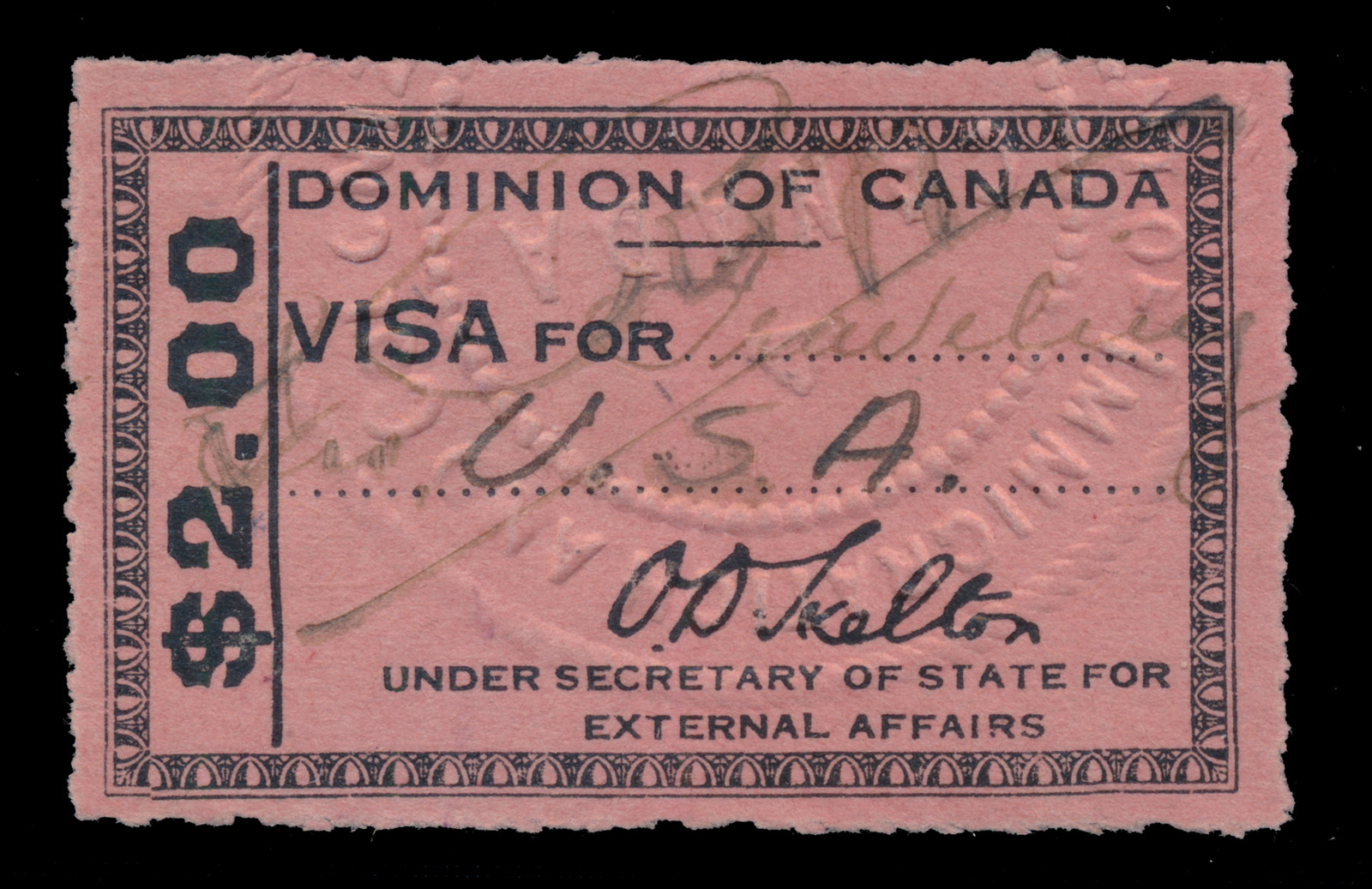 Lot 357 Canada #FVF1 $2 black on pink Dominion of Canada Visa Fee stamp, rouletted, with manuscript cancel, a scarce issue used on passports and travel documents, with no mint examples known to exist, a choice example of this rarity, fine to very fine; with 2010 van Dam certificate. Ex-Simone Collection. van Dam C$4,500.