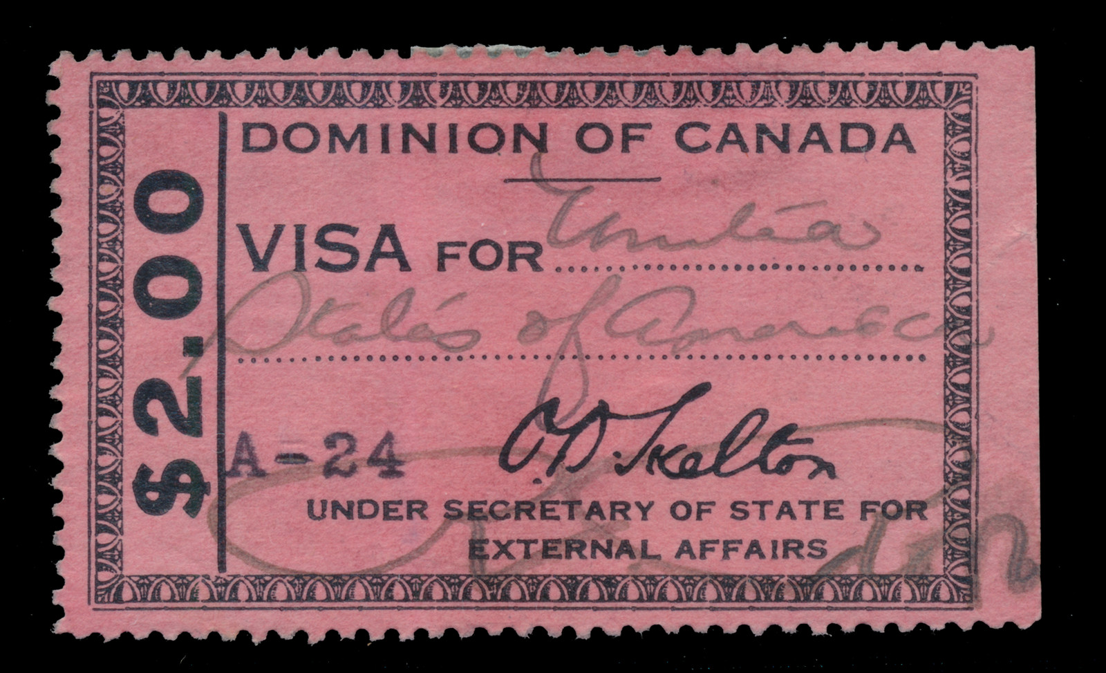 Lot 358, Dominion of Canada two dollar black on pink Visa Fee stamp, F-VF, sold for C$3,540Lot 358 Canada #FVF2 $2 black on pink Dominion of Canada Visa Fee stamp, perforated 12, cancelled in manuscript, one straight edge, used on passports and travel documents, with no mint examples known to exist, fine to very fine and rare; with 2014 van Dam certificate. Ex-Simone Collection. van Dam C$ 2,000, sold for C$3,000.00 plus 18% buyer’s premium.
