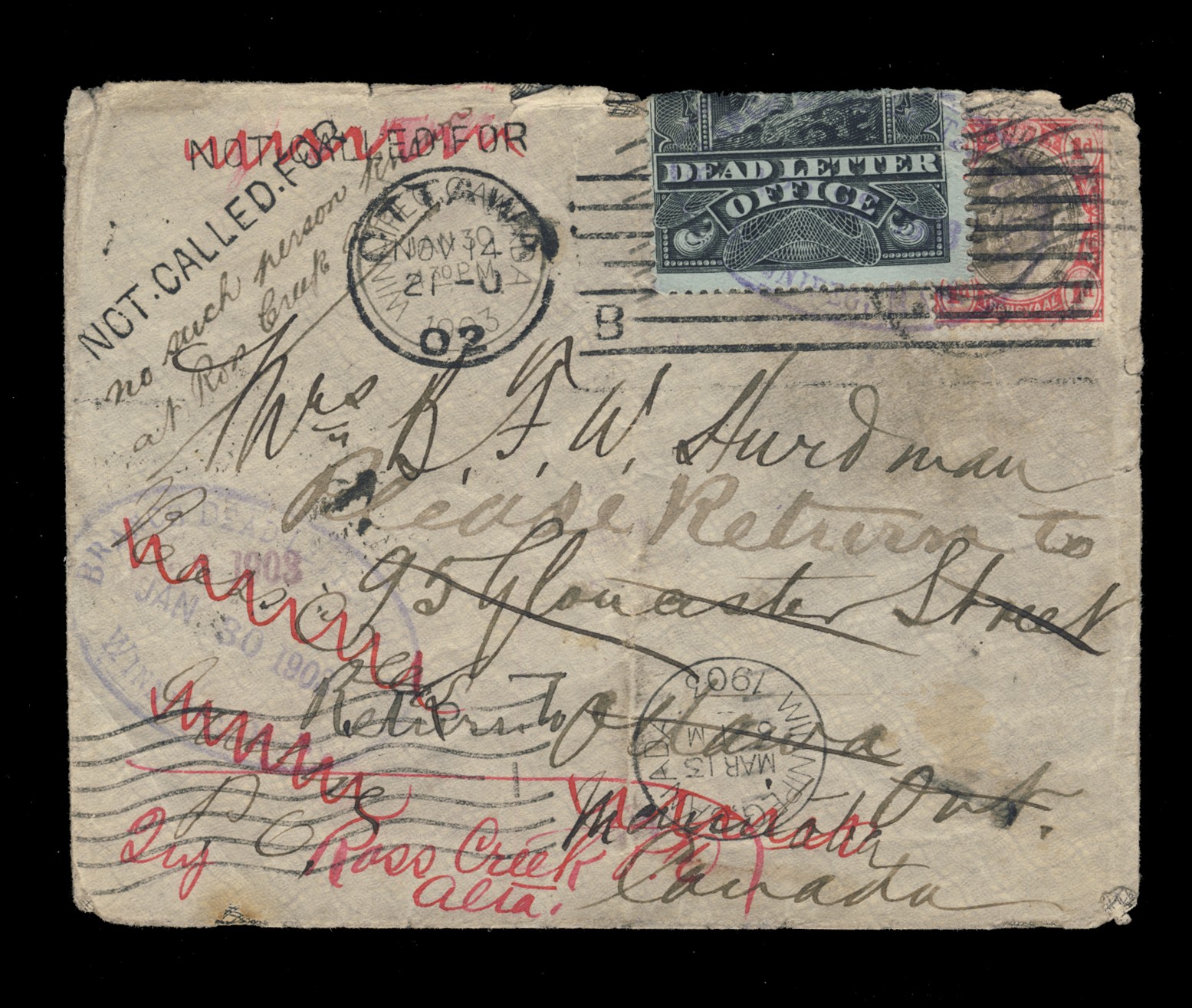 1903 Queen Victoria Officially Sealed Stamp on bluish paper used on cover, originating from Johannesburg, Transvaal, franked by 1d. King Edward paying the letter rate to Ottawa where it was redirected to Ross Creek, Alberta. Letter has cancels from Winnipeg Dead Letter Office (JA 30 1903) Fort Saskatchewan, AB (FE 3 1903), Bruederheim, AB (MR 7 1903), Winnipeg, MB (MR 12 1903), Winnipeg Dead Letter Office (MR 22 1903), Bruederheim, AB (MR 28 1903), Ross Creek (AP 08 1903). Finally the letter was returned to Transvaal and has a Johannesburg JU 20 1903 Dead Letter Office cancel tying the Officially Sealed Stamp to the cover. Stamp has been severed in 2 pieces from opening of the letter, which is consistent with its use, otherwise the cover is actually quite nice given the extent of its travel. This is likely the most exotic known usage of OX2 and represents a lovely exhibit item. Accompanied by 2009 Richard Gratton AIEP certificate. Unitrade CV $4000