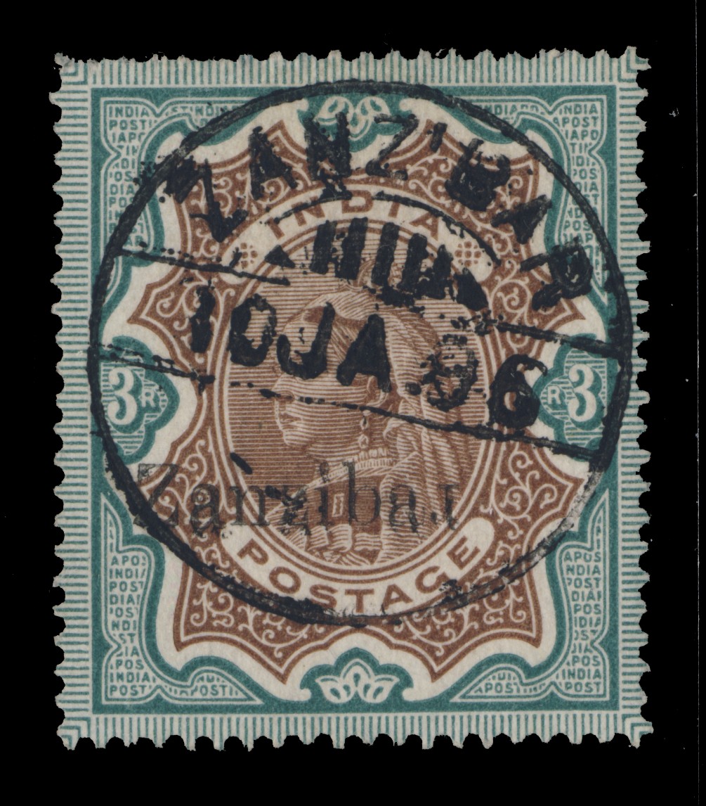 Zanzibar #16b, 1895 3r green and brown Victoria with inverted "r" in "Zanzibar" overprint, attractive and well centered with full Zanzibar cds cancel dated 10.JA.96. There are a few shorter perfs at top which are mentioned for accuracy only and which are not mentioned in the accompanying 1995 Royal Philatelic Society of London certificate ("used is genuine"). This is one of the rarest major errors of Zanzibar, with only a few examples recorded, and even rarer in used condition (we do not recall seeing another used example). A lovely showpiece for the serious British Africa collector (SG 20k £4,750 = $9,500). Scott CV $5250