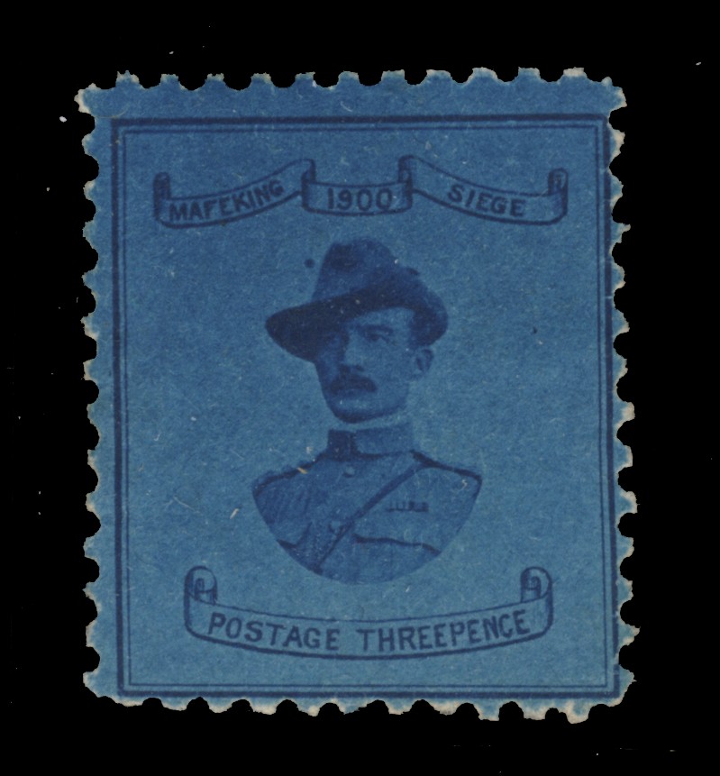 Cape of Good Hope 1900 3d deep blue on blue paper General Baden-Powell, small size, unused no gum with rich colour, fine. A lovely example of this elusive mint stamp, printed during the siege of Mafeking. One of very few stamps produced and printed completely through photographic process. The lack of gum has actually preserved the overall freshness of this stamp and the rich colour. Scott CV $1400