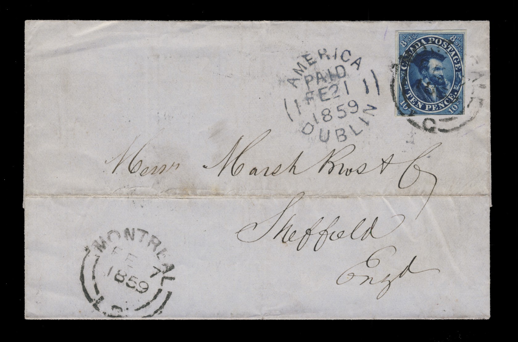 Canada #7, 1855 10d blue Cartier on cover to England, originating from Montreal FE.7.1859 with a second strike used to obliterate the stamp, addressed to Sheffield, England, with America-Dublin PAID FE.22.1859 transit marking and Sheffield FE.22.1859 arrival backstamp. Margin is cut just into frameline at bottom and clear to full other sides, horizontal filing fold well away from stamp, crisp sharp impression and overall fine-very fine. This is the first 10d cover we can recall seeing with the America-Dublin transit marking and, more importantly, the only cds cancelled 10d Cartier cover. Accompanied by 2009 Greene Foundation certificate. Unitrade CV $3000