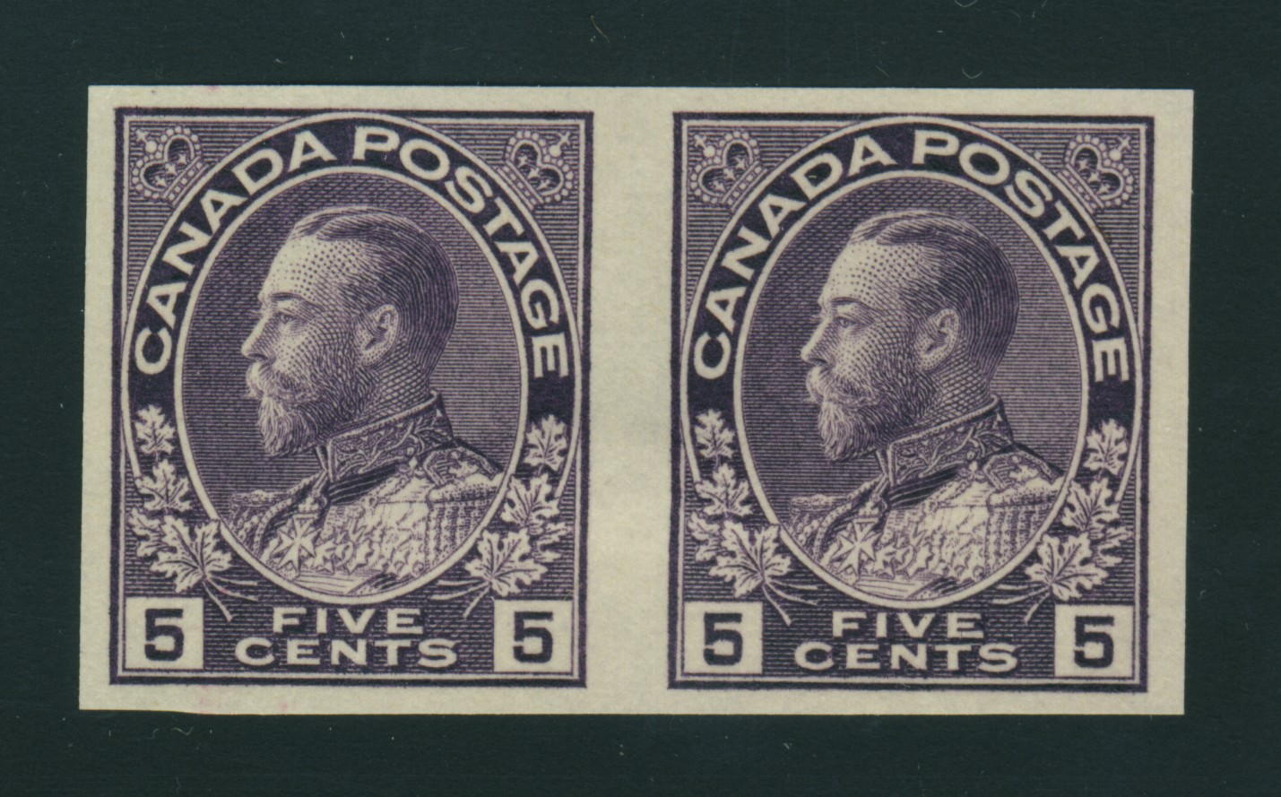 Canada #112b, 1922 5¢ violet Admiral imperforate pair, fresh, hinged and very fine. A rare imperf item. Unitrade CV $3000, realized $1840 including premium.