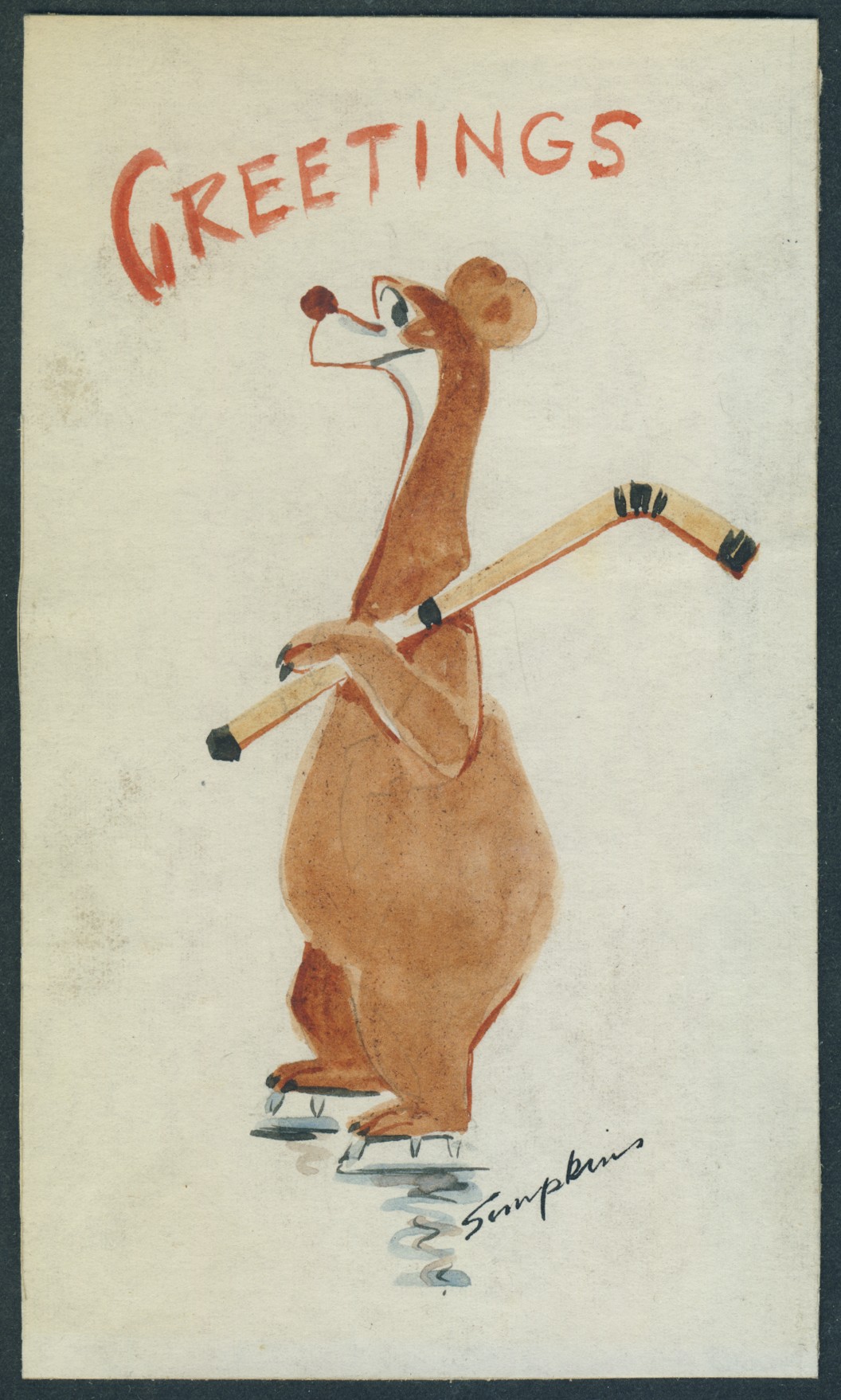 Canada #359, 1956 5¢ Hockey signed by designer, matched set of plate blocks, never hinged, autographed by James Simpkins, who was well-known for his cartoon character, a bear named Jasper. Includes a small original watercolour on card of Jasper by Simpkins. Estimate $100