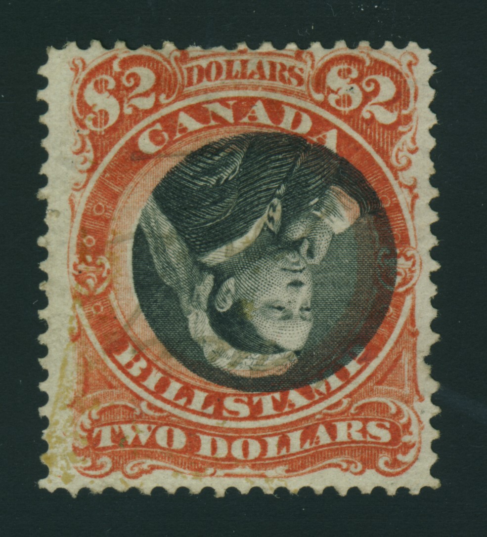 Canada #FB53a, 1868 $2 Queen Victoria Third Bill issue with inverted center, used with light manuscript cancel, fresh colour and pleasantly centered with one missing perf at right, fine. Accompanied by 2009 Richard Gratton AIEP certificate. An attractive example of this world class rarity. Van Dam CV $12,500