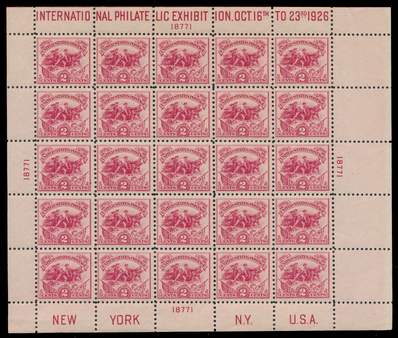 Lot 498 USA #630 1926, 2c carmine rose “White Plains”, sheet of 25, never hinged, though catalogued at the lowest value due to some gum skips and carmine offsets from being laid upon another sheet, typical gum bends, else fresh and fine to very fine. Scott CV U$275, sold for C$225.00 plus 17% buyer’s premium.
