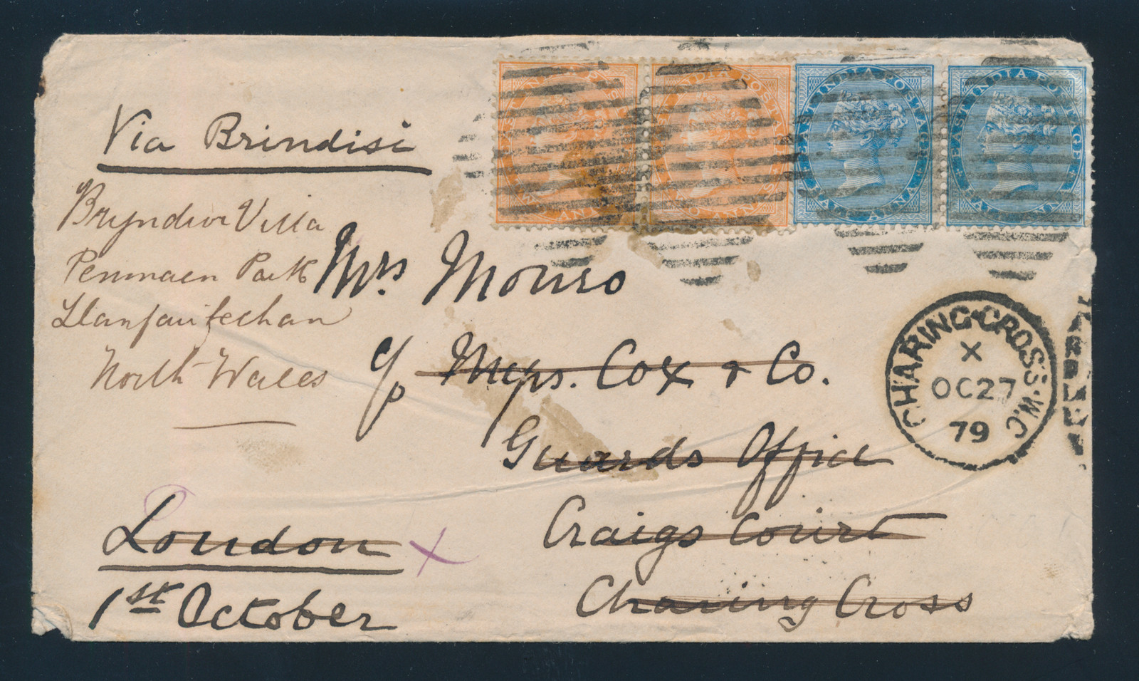 Lot 684 India 1879, ½a blue pair and 2a orange pair, on cover forwarded from London to Wales, both tied by diamond grid cancel (Cooper Type 17) to the Guards Office in Charing Cross, London, endorsed “via Brindisi”, received on 27 Oct, crossed-out and forwarded to Llanfairfechan, Wales, backstamped Bodinaknore (27 Oct), Bombay (6 Oct), London (27 Oct), Bangor (28 Oct) and Llanfairfechan (28 Oct), opening tear to back, a scarce cancellation on an attractive redirected cover, fine. Estimate C$150, sold for C$200.00 plus 17% buyer’s premium.