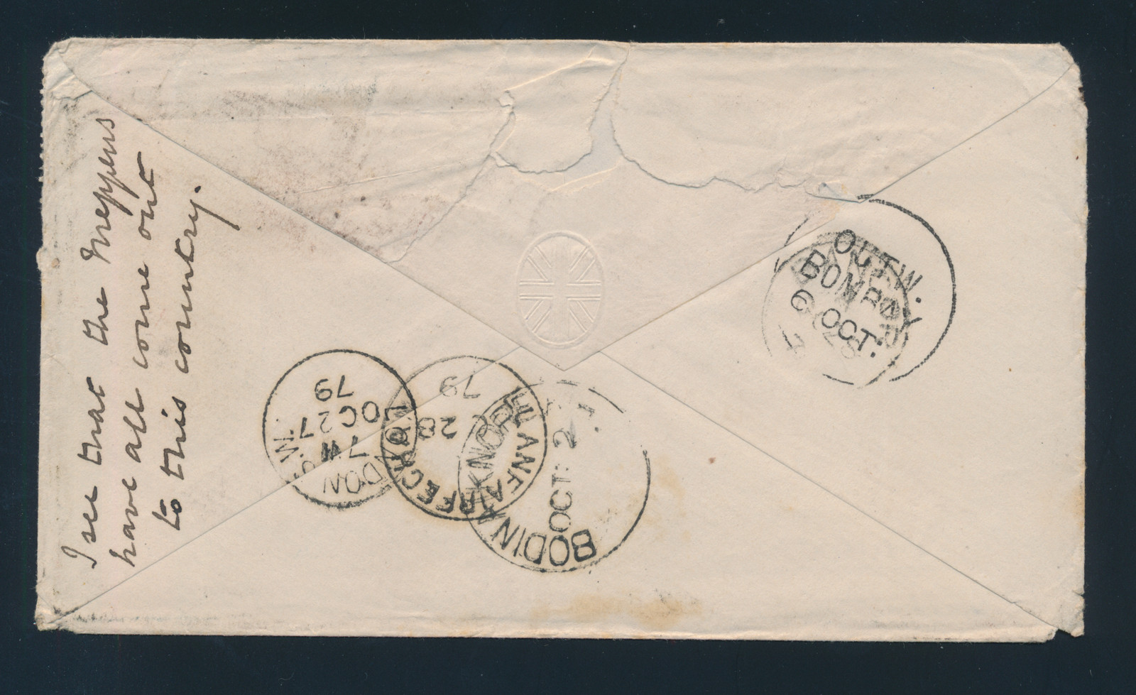 Lot 684, 1879 India cover Bombay to London forwarded to Llanfairfechan Wales, sold for C$234