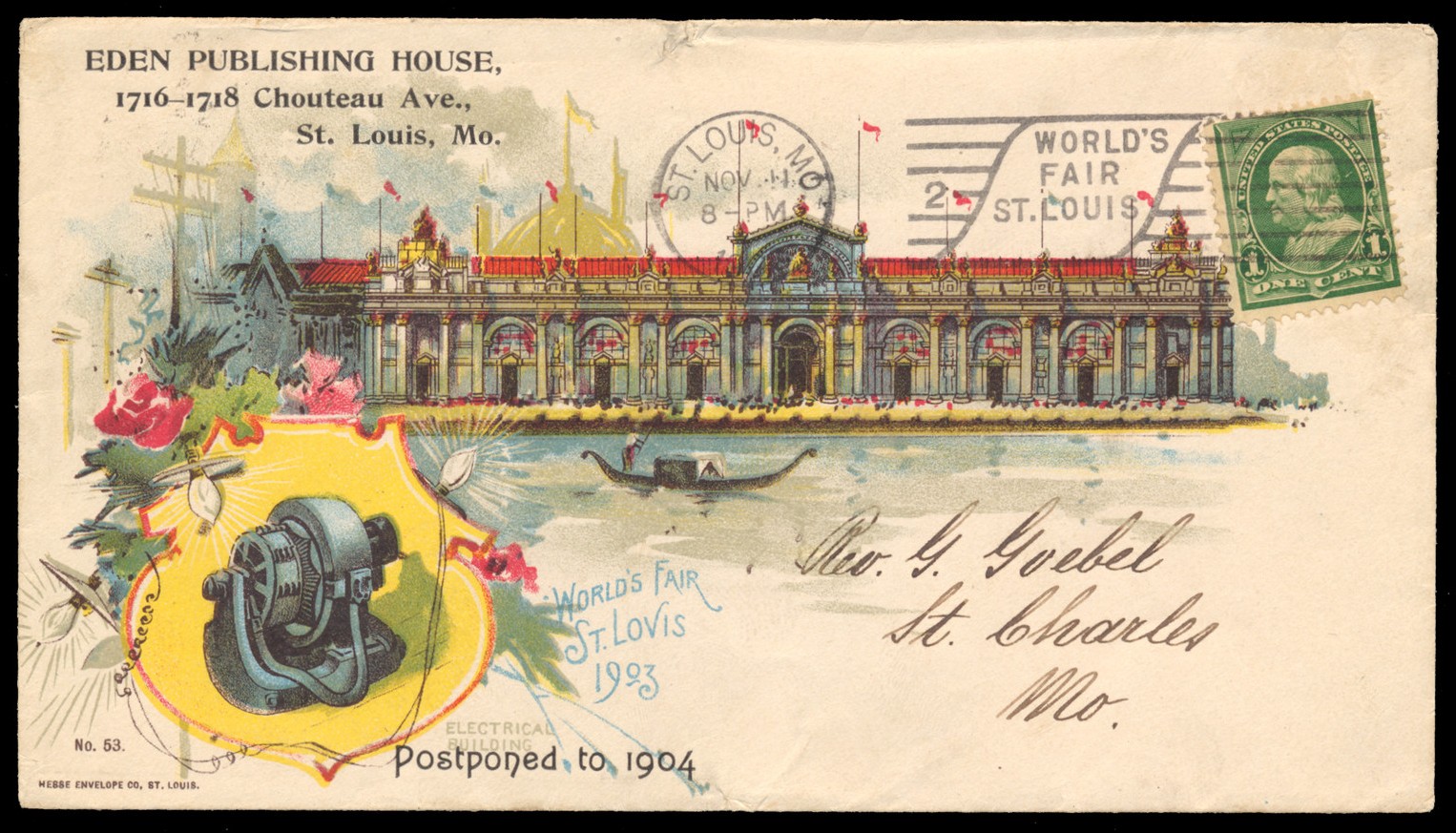 Lot 892 United States 1903 (November 11), St. Louis World’s Fair, Electrical Building cachet, printed by Hesse, overprinted “Postponed to 1904”, franked with 1c Bureau issue, tied by St. Louis “World’s Fair” slogan cancel, corner card of the Eden Publishing House, to St. Charles, Missouri, a lovely and colourful cover, very fine. Estimate C$100.