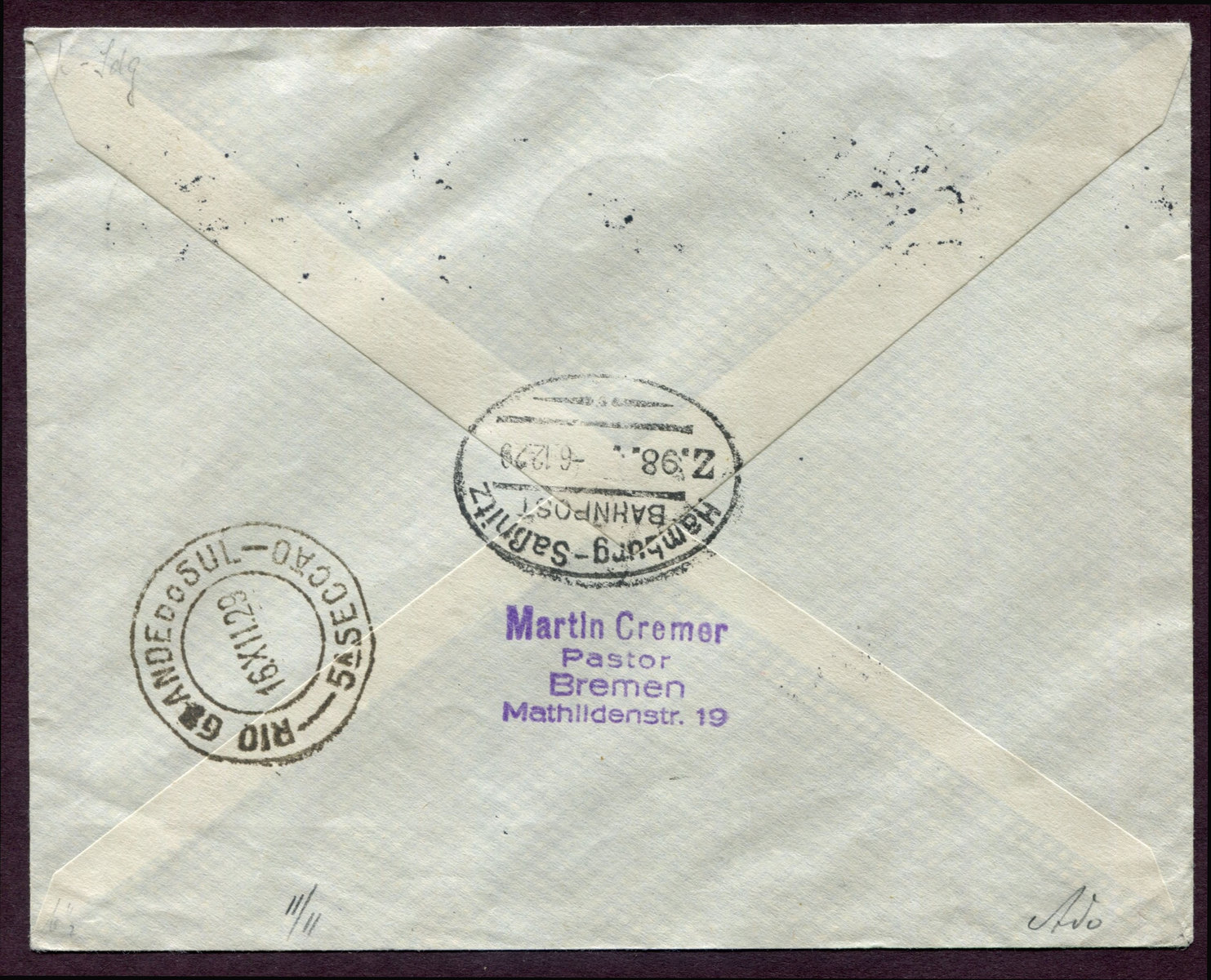 Lot 128 Denmark #C4, C6 1929 (December 29), registered airmail cover from Copenhagen to Porte Alegre, Brazil, franked with a pair of 50ø gray and a single 1k chocolate Air Post, each tied by “Kobenhavn” c.d.s., bearing registration and airmail etiquettes, endorsed “Par Avion: France – Amérique du Sud,” with “Rio do Sul 16.XI.29” receiver on reverse alongside oval “Hamburg-Sassnitz” (12 Jun) railroad transit, a fine transatlantic airmail usage conveyed via Germany and France. (Sc. #C4, C6). Sold for C$180.00 plus 17% buyer’s premium.