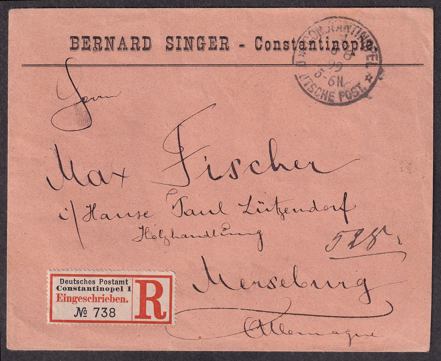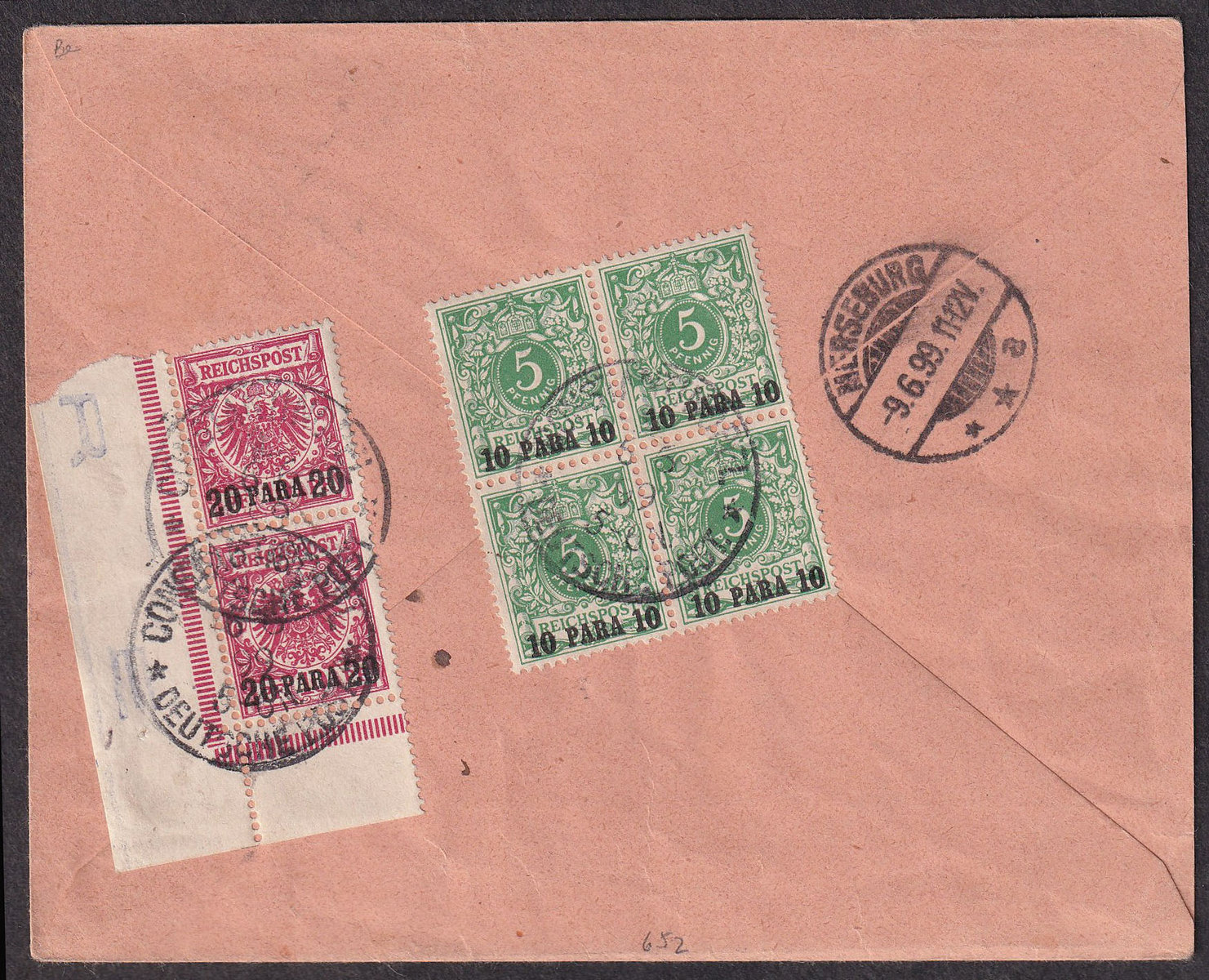 Lot 187 German Offices in the Levant #37, 42 1907 (April 22), registered cover from Beirut to Ancon, Canal Zone, franked with 20 Para on 10Pfg carmine and 2½Pi on 50Pfg purple & black Germania issues, each tied by “BEIRUT DEUTSCHE POST” single-circle cancellations, New York (12 May) double-oval transit markings on reverse, with violet circular Ancon, Canal Zone (24 May) receiver and red registration marking (28 May) on front, a fine example to a unusual destination. (Sc. #43, 49; Mi. #37, 42). Sold for C$375.00 plus 17% buyer’s premium.