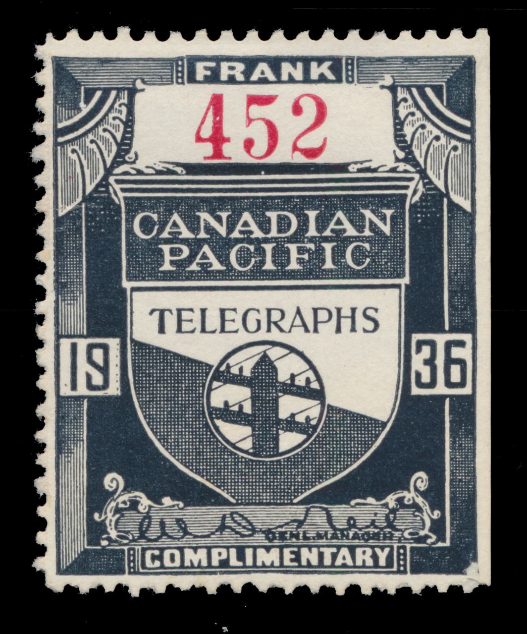 Lot 376 Canada #TCP1-TCP49 1887–1936, Canadian Pacific Railways Telegraph franks, a complete set, mint hinged or without gum, each with blue or red overprinted serial numbers, a scarce and unusual opportunity to acquire the full range in one offering, fine to very fine. van Dam CV$2,604.