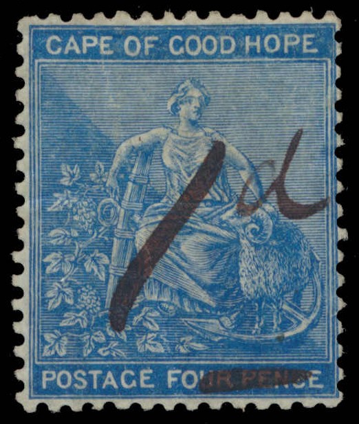 Lot 682 Griqualand West #1 1874, 1d on 4d blue of the Cape of Good Hope, manuscript surcharged in dark red by the Kimberley Postmaster, unused, without gum, centred to the right, vertical crease, but a scarce stamp, fine appearance, signed Jules Bernichon. (S.G. 1, £2,000). Scott CV U$1,900.