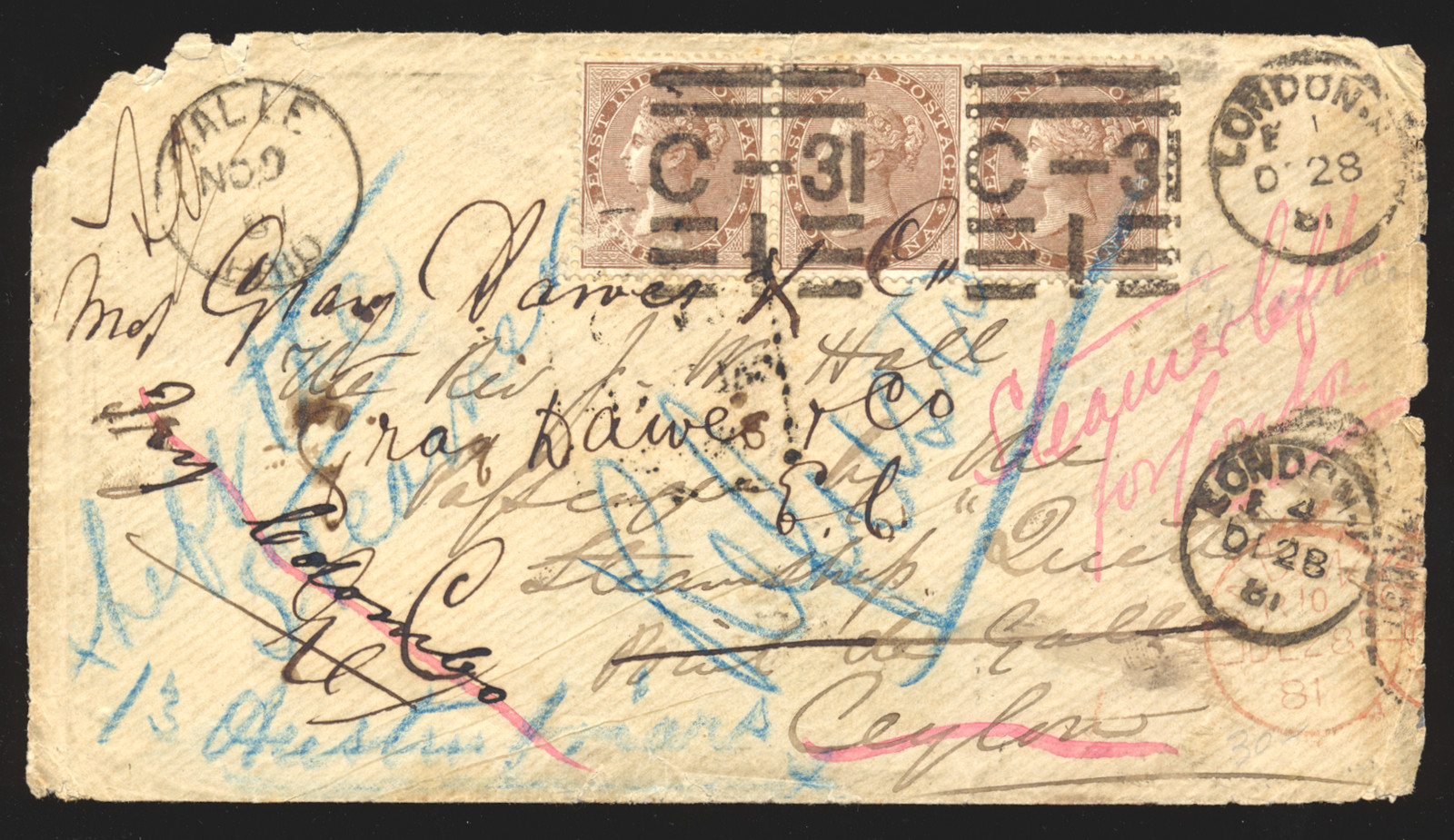 Lot 303 India #39 1880/1, 1a brown (x3) , cover to Rev. J.W. Hall aboard the Steamship “Quetta” at Point de Galle, Ceylon, strip tied by boldly-struck C-3 I (R.L. Type 17d), crossed-out and endorsed “Try Colombo”, “Steamship Left for London”, and “Left the Steamer / Refused”, the cover having been carried to London and then returned, multiple datestamps with ?IDAIPUR (13 Oct), OUTW BOMBAY (17 Oct), Galle (2- Oct and 9 Nov), Colombo (Nov 1-), Calcutta (5 Dec), London (28/29 Dec), DLO Bombay (20 Jun) and DLO Calcutta (29 Jun), opened on three sides for display, bottom fragile, typical faults as expected on such a well-traveled cover, a delightful item with tremendous visual appeal. Sold for C$200.00 plus 17% buyer’s premium.