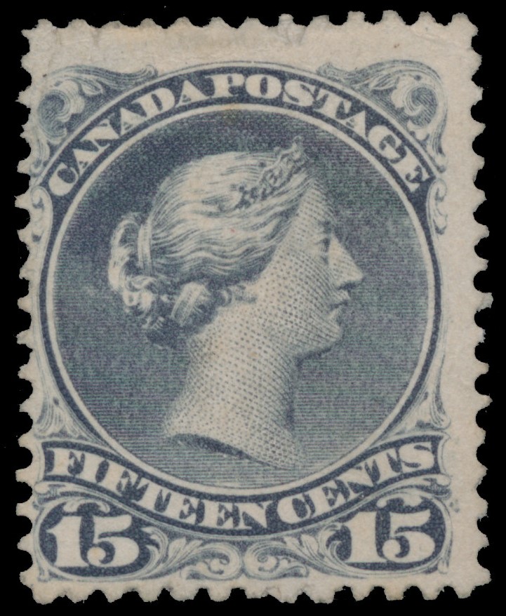 Lot 28 Canada #30ciii 1868-76, 15c grey Large Queen, thick paper, with “Pawnbroker” variety, unused, without gum, good colour, thinned at upper left and light horizontal bend, an otherwise fine and extremely scarce example of this uncommon paper, coupled with the distinctive Pawnbroker variety; with 2024 Greene Foundation certificate. Estimate C$3,000.