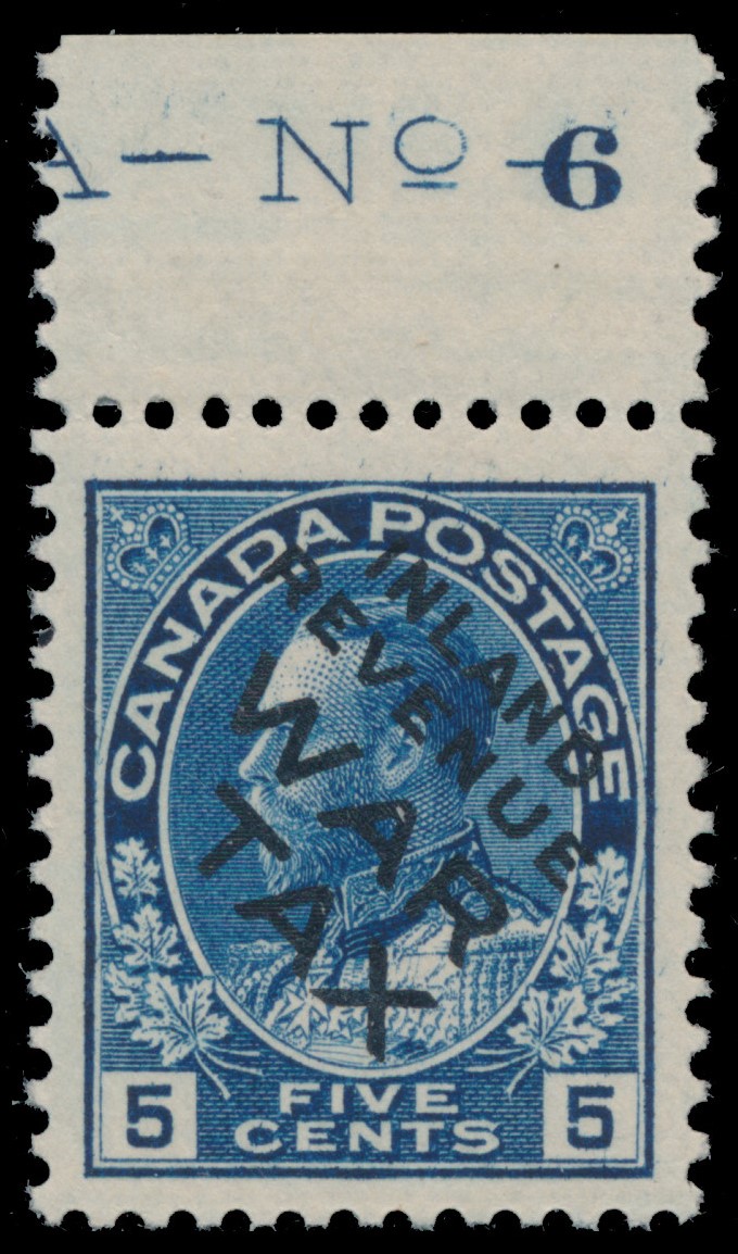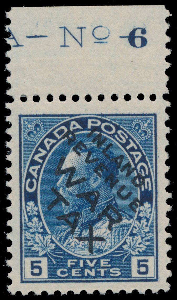 Lot 272 Canada #MR2Bi 1915, 5c blue Admiral, overprinted INLAND / REVENUE / WAR / TAX in black, a never hinged upper margin single, showing partial plate imprint “No. 6” at top, exceptional centering, a lovely stamp, extremely fine; with 2022 Greene Foundation certificate. Unitrade CV$1,200.