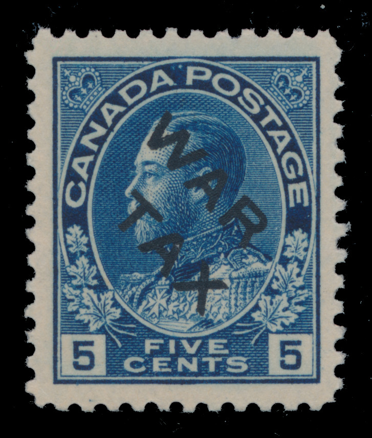 Lot 285 Canada #MR2B 1915, 5c blue Admiral, overprinted WAR TAX in black, never hinged, bright fresh colour and select centring, a superior example of this difficult stamp, extremely fine; with 2001 Greene Foundation and 2019 (XF 90) P.S.E. certificate. Unitrade CV$1,600.