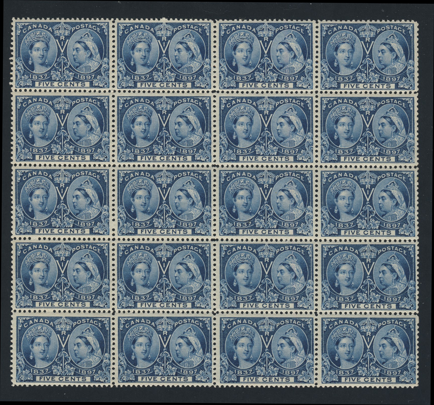Lot 101, Canada #54 1897 5c deep blue Jubilee, mint never hinged block of 20, minor perf separation on a few stamps. CV is for fine-very fine. A real showpiece with deep fresh colour from an old-time collection. Unitrade CV C$3300.