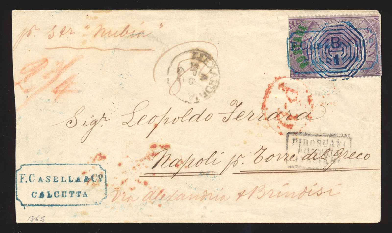 Lot 278 India 1848 (18 August) Calcutta to France, stampless folded letter, datelined Calcutta, boxed INDIA and INDIA PAID in red, to Nantes, endorsed “p. Overland Express Mail via Marseille”, Bordeaux c.d.s. backstamp (3 Oct), a fine stampless letter to France. Sold for C$190.00 plus 17% buyer’s premium.