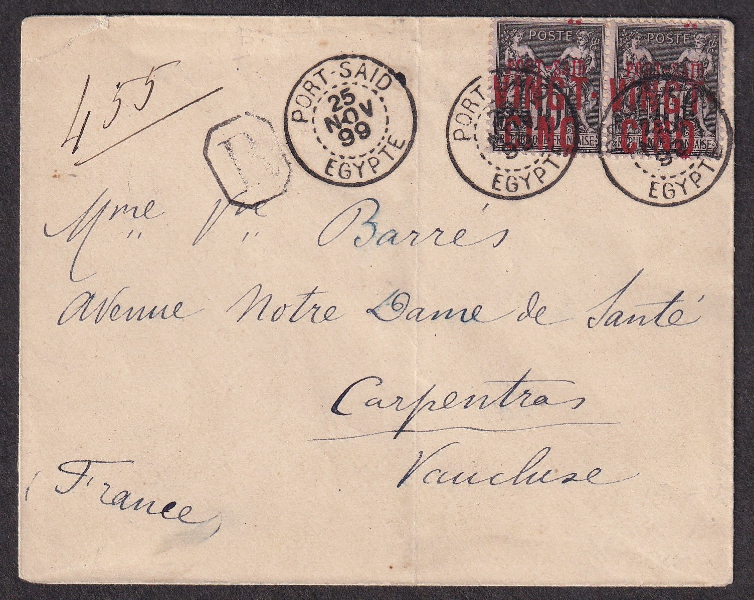 Lot 182 France #16 Port Said, 1899 (November 25), registered cover from Port Said to Carpentras, France, franked with pair of 25c red overprinted “PORT-SAID VINGT-CINQ” on black 10c Sage definitives, tied by “PORT SAID EGYPT” double circle cancellations, backstamped with “LIGNE T PAQ.FP. No. 2” (27 Nov) octagonal transit marking and “AVIGNON, VAUCLUSE” (2 Dec) c.d.s. receiver, light vertical crease, else fine. (Sc. #16(x2), $275). Sold for C$450.00 plus 17% buyer’s premium.