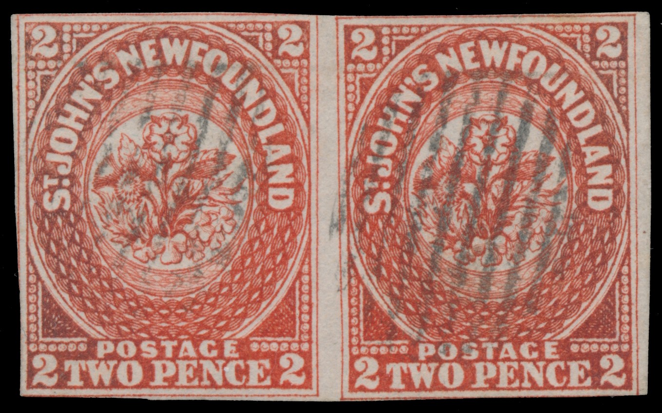 Lot 317 Newfoundland #2 1857, 2d scarlet vermilion Heraldic, horizontal pair, mostly clear margins, touching in places, rich deep colour, neatly-struck with light grid cancels, a fine pair and tremendous rarity, one of only two such examples recorded; with 2009 Philatelic Foundation certificate. Unitrade CV$12,000.