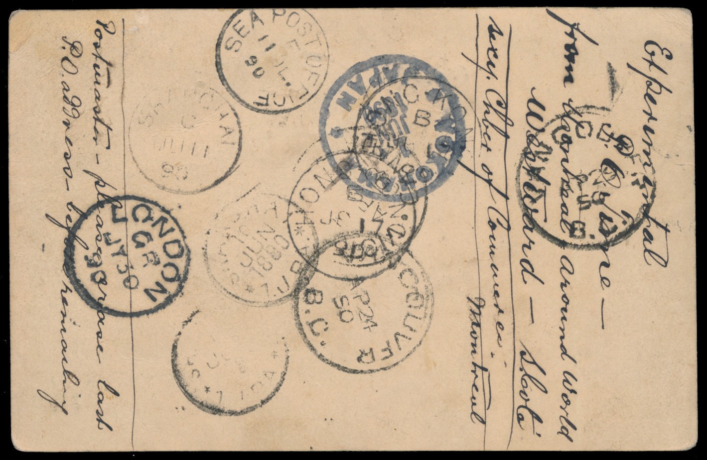 Lot 649 1890 (April 18), 2c “Around the World” postal stationery card, despatched from Montréal, with sender’s notations on reverse “Experimental P.O. time / from Montréal Around World Westward”, with further instruction “Postmaster – please erase last P.O. address before remailing,”, struck on front and back with myriad markings tracing the card’s journey via Vancouver (24 Apr), Victoria (25 Apr), Yokohama, Japan (2 Jun), Shanghai, China (11 Jun), Hong Kong (17 Jun), Bombay, India (11 Jul), and London, England (30 Jul), returning to Montréal on August 8, for a total transit time of 113 days, some edge wear and corner creases as expected for such a well-traveled card, a scarce and striking card with tremendous visual appeal. Estimate C$300.