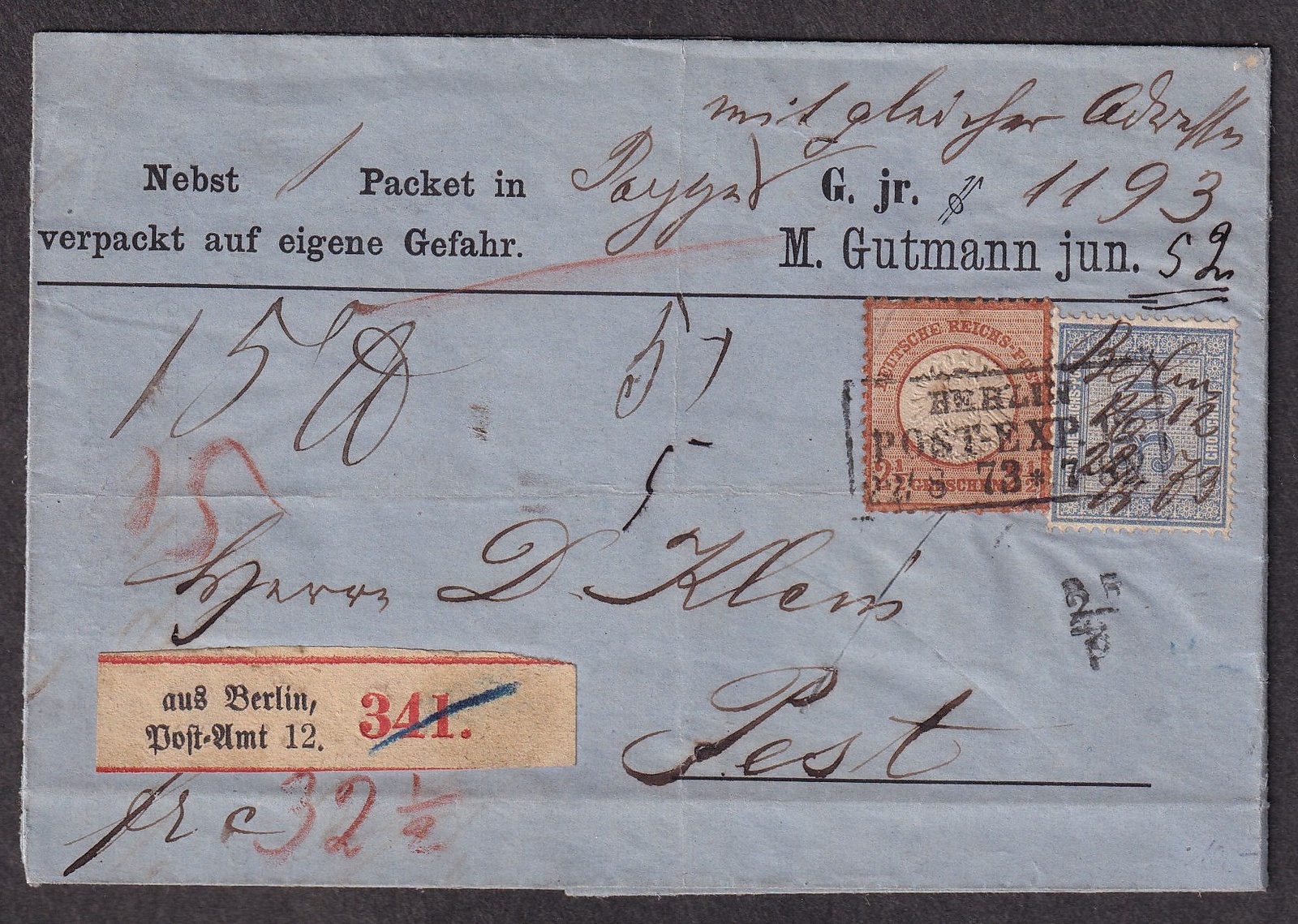1873 (August 22), folded money letter from Berlin to Pest, Hungary, with contents, franked with 30Gr blue Numeral and 2½Gr orange brown Eagle & Large Shield issues, cancelled by black boxed “POST-EXP. 1” handstamp, additional manuscript cancellation on 30Gr value, with red “aus Berlin Post-Umt 12” registration label on front, no markings on reverse, small pieces missing from side folds, not affecting overall appearance, a scarce franking; internally signed “HENNIES BPP”. (Sc. #13, $1,350 with pen cancellation and postmark; 19; Mi. #13, €1,800 with pen cancellation and postmark; 21a). Sold for C$850.00 plus 17% buyer’s premium.