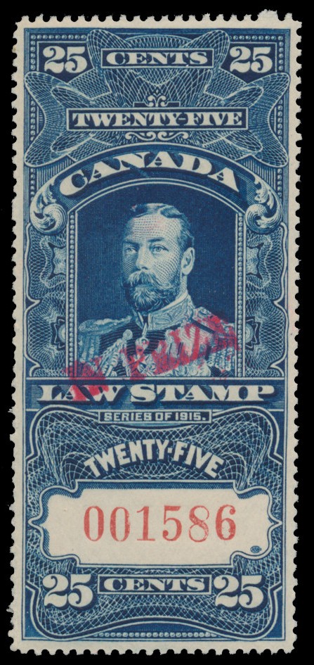 Lot 382 Canada #FSC31 Supreme Court, 1916, 25c blue King George V, “IN PRIZE” overprint in red, with red control numbers, never hinged original gum, fresh colours and nicely-centered, a choice example of this rare overprint, very fine. van Dam C$2,500.