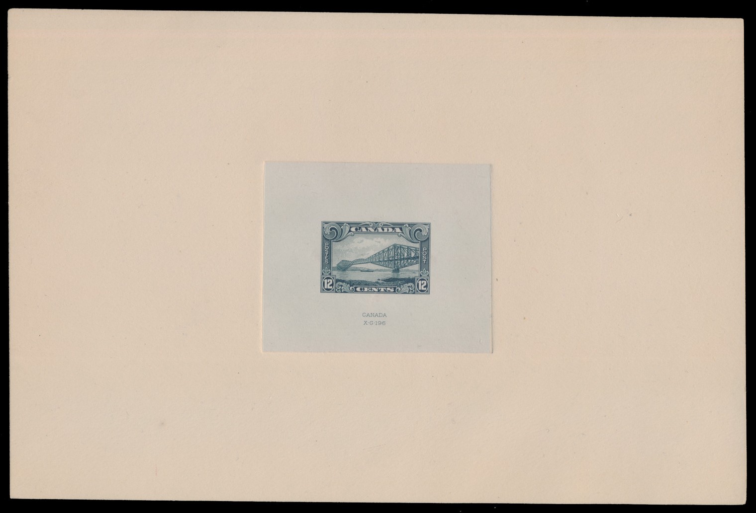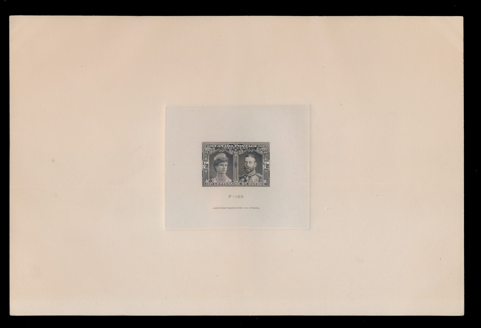 Lot 186 Canada #96DP ½c black brown Prince & Princess of Wales, die proof, on India paper, 72 x 62mm, with “F-199” and “American Bank Note Co Ottawa” imprint below, die-sunk on full-size card, approximately 230 x 152mm, lovely deep colour and impression, an exceptional example, scarce as such, extremely fine. Estimate C$1,000.