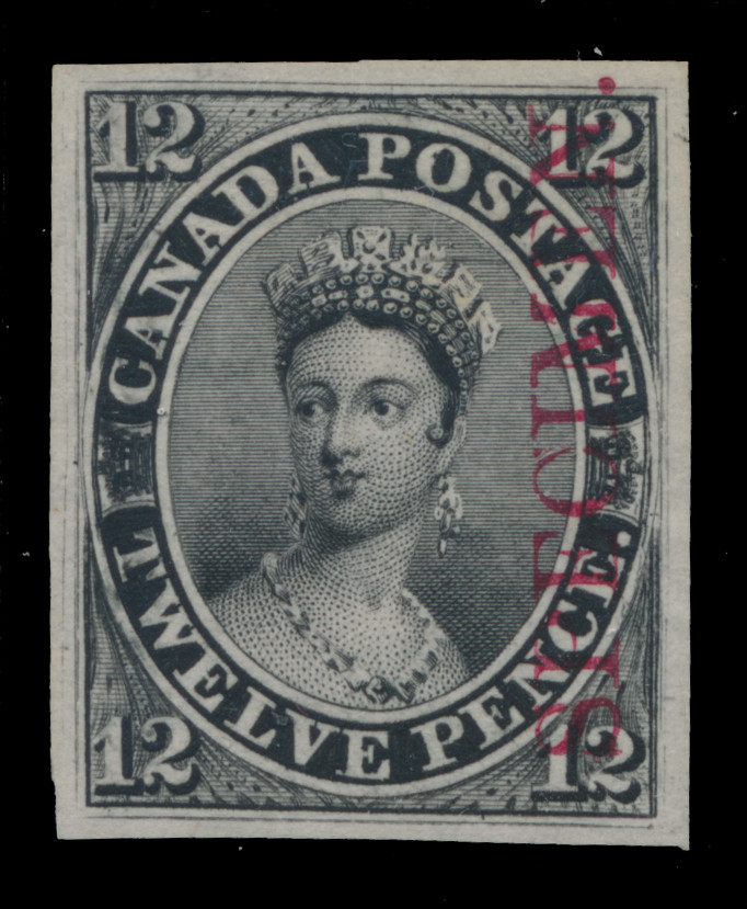 Lot 11, Canada 1851 twelve penny black plate proof on india paper with vertical SPECIMEN overprint