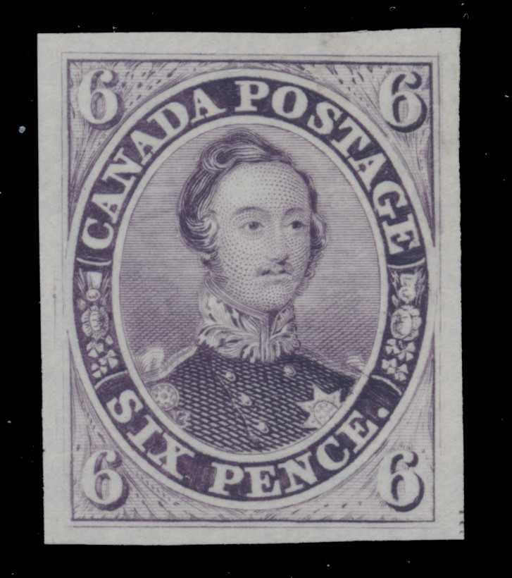 Lot 4 Canada #2TCi 1857, 6d red purple Consort, trial colour plate proof, on India paper, large to very large margins, pleasing deep shade, very fine. Unitrade CV$325, sold for C$425.00 plus 18% buyer’s premium.