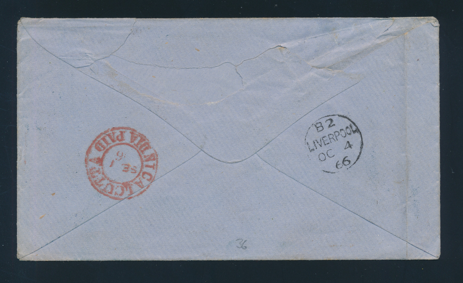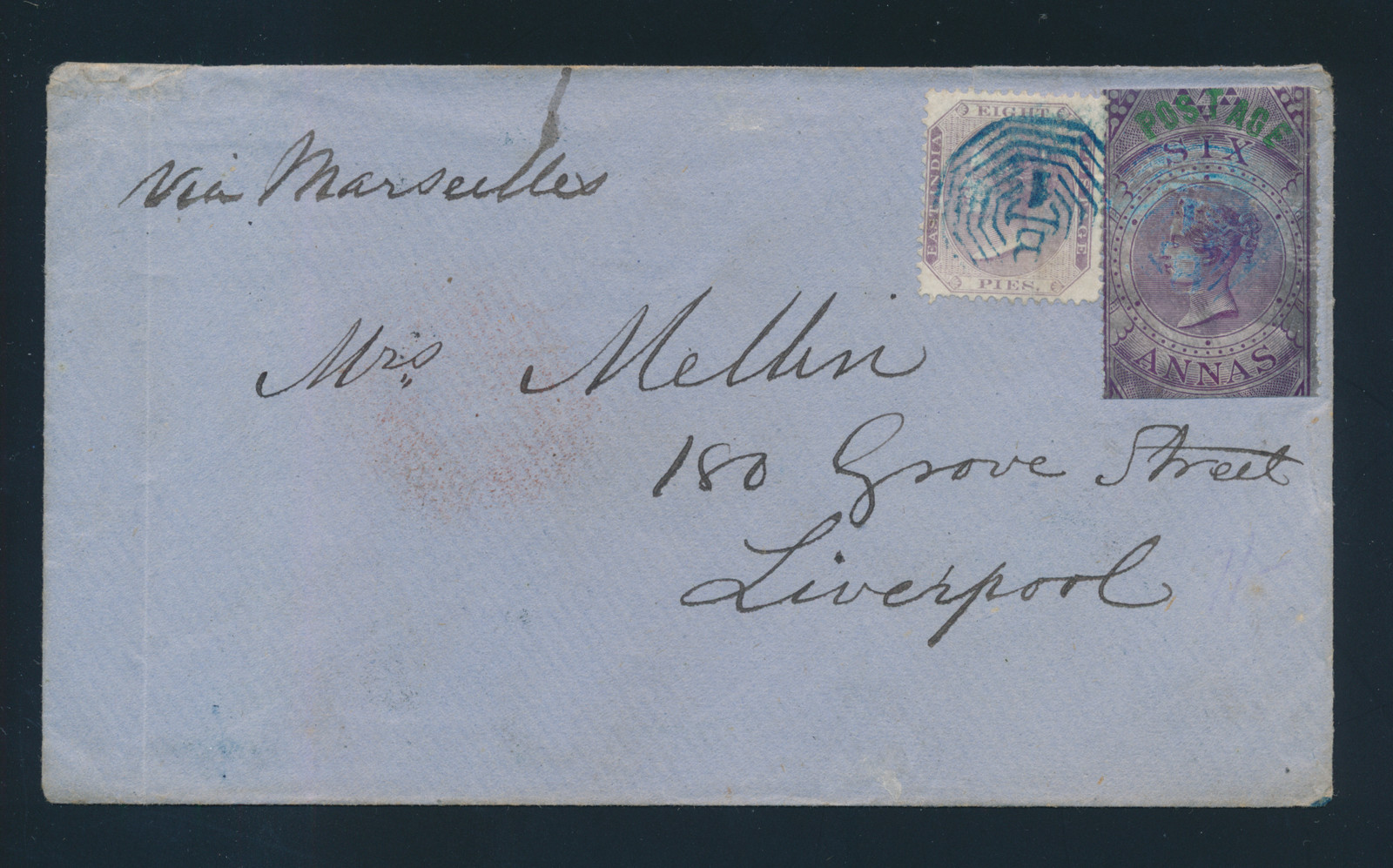 Lot 675 India 1866, 8a mauve and 6a purple Fiscal, overprinted “POSTAGE” in green, (Type I, S.G. 66), cancelled with blue “B/1” octagon, to Liverpool, endorsed “via Marseilles”, with red “CALCUTTA INDIA PAID / SE 1 66” transit and Liverpool (4 Oct) arrival backstamps, piece torn from back flap, a scarce franking. Estimate C$120, sold for C$1,250.00 plus 17% buyer’s premium.
