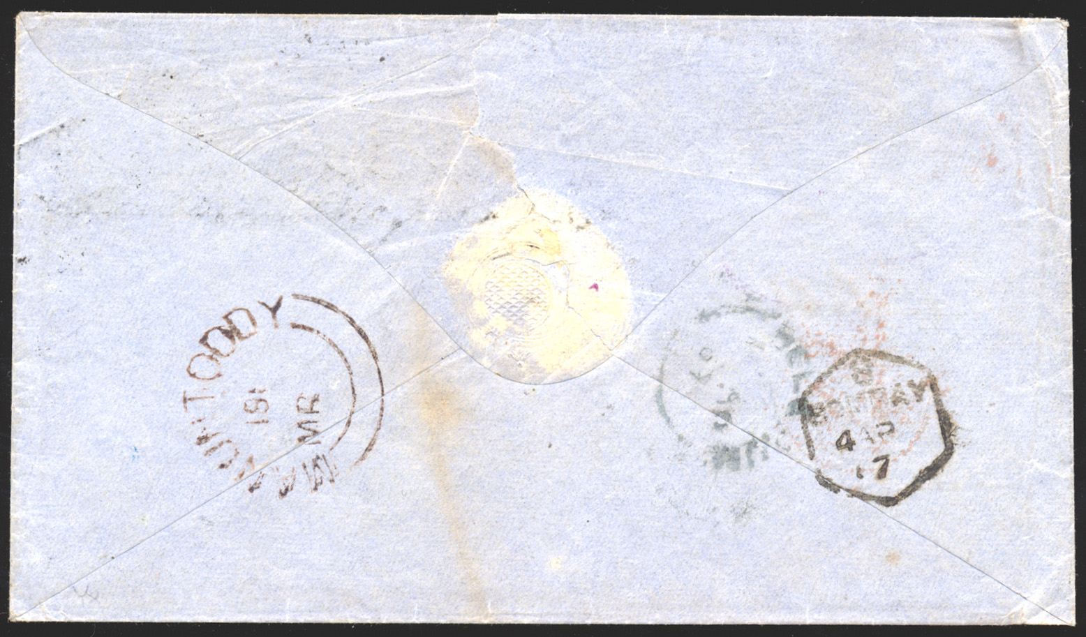 Lot 294 India 1867, 2a orange, 4a green, and 8p mauve, tied to cover by “48” diamond cancel, INDIA PAID crescent handstamp, Manuntoddy double split-ring despatch backstamp, Bombay (4 Apr) transit, to London, with 6 May receiver on front, embossed red “VIA MARSEILLES” endorsement, an appealing cover with a scarce printed route directive, some edge creasing, else fine. Sold for C$475.00 plus 17% buyer’s premium.